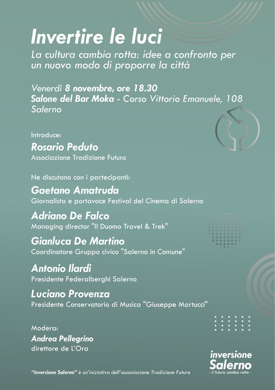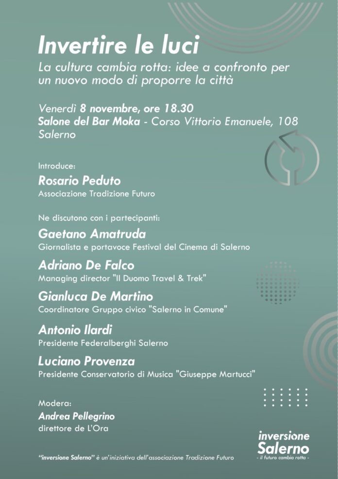 L’Associazione Tradizione Futuro annuncia il convegno intitolato “Invertire le luci. La cultura cambia rotta: idee a confronto per un nuovo modo di proporre la città”, che si terrà l’8 novembre dalle ore 18.30 presso il Salone del Bar Moka di Salerno.