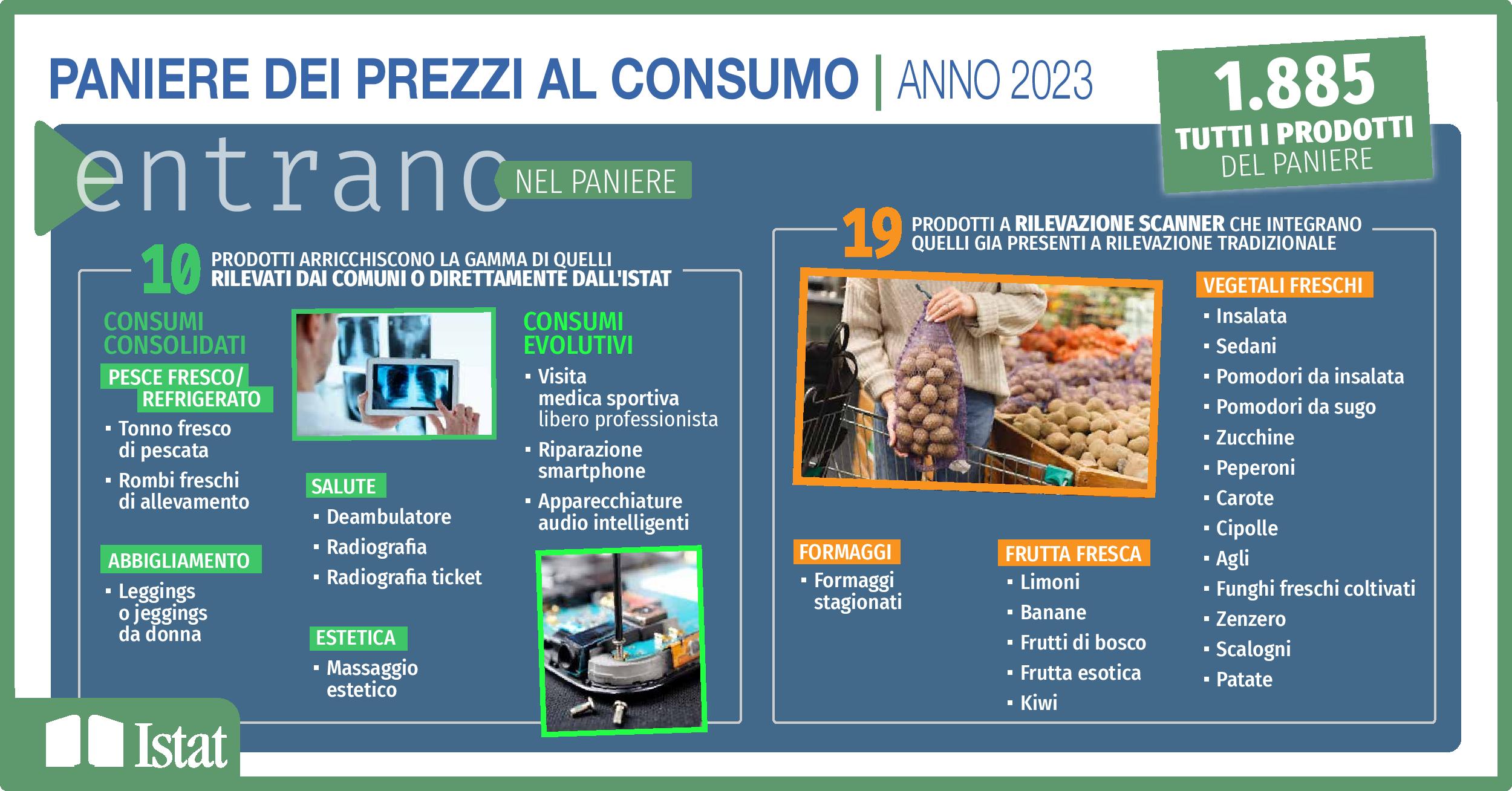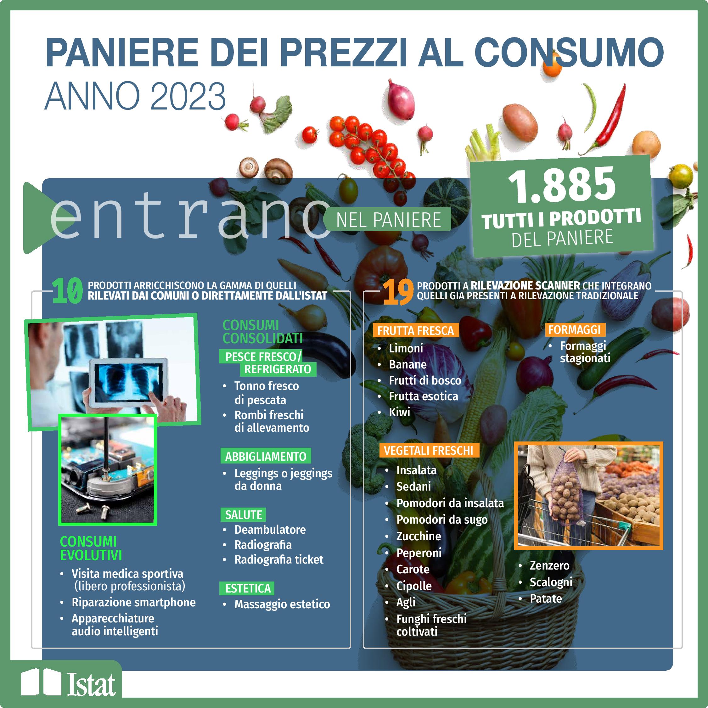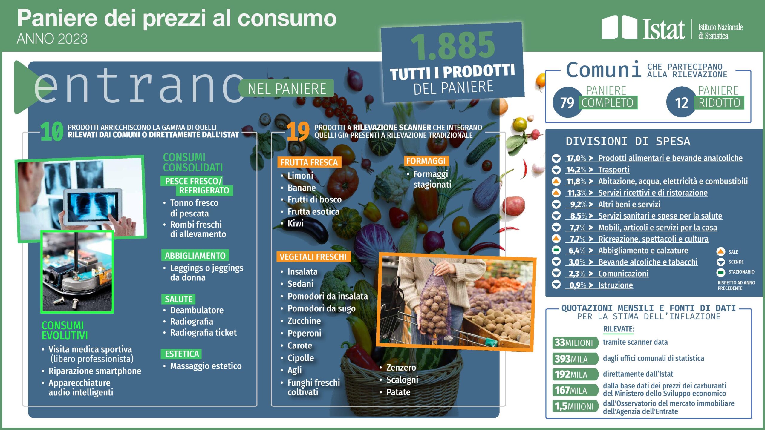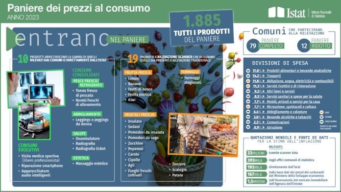 Nel paniere del 2023 utilizzato per il calcolo degli indici NIC (per l’intera collettività nazionale) e FOI (per le famiglie di operai e impiegati) figurano 1.885 prodotti elementari (1.772 nel 2022), raggruppati in 1.061 prodotti, a loro volta raccolti in 423 aggregati.
