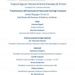 Alla conferenza di presentazione interverranno il Sindaco di Salerno, Vincenzo Napoli, l’assessore alle Politiche Sociali, Giovanni Savastano, il presidente dell’ANS Campania, Domenico Condurro, il Direttore della rivista scientifica, organo ufficiale ANS, “Sociologia – La società… in rete”, Camillo Capuano, il presidente della commissione nazionale comunicazione dell’Associazione Nazionale Sociologi, Arturo Di Giacomo, il dott. Vittorio Cantone, Coordinamento Regionale della Fondazione AdAstra, l’on. Piero De Luca, vicecapogruppo Pd alla Camera dei Deputati.