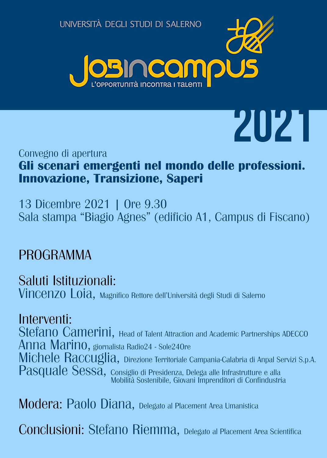 Dal 13 al 17 dicembre l’Ateneo organizza “Job in Campus”, il tradizionale e fondamentale appuntamento di orientamento al lavoro, curato dal Servizio Placement per favorire e supportare l’incontro tra il mondo delle aziende e le studentesse, gli studenti, le laureate e i laureati dell’Università di Salerno.