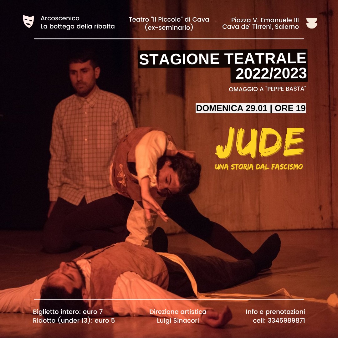 Il 29 gennaio dalle 19 al Teatro “Il Piccolo” di Cava de’ Tirreni, l’Associazione Arcoscenico inaugura l’anno teatrale proseguendo la propria “Stagione Teatrale 2022-23 – Omaggio a Peppe Basta”. In scena con “JUDE – Una storia dal fascismo”, testo che mette al centro esistenze giovani e adolescenti, spiriti liberi-sognatori e anche un po’ ribelli, sullo sfondo di un contesto storico di deportazione, reclusione e rastrellamenti.