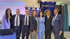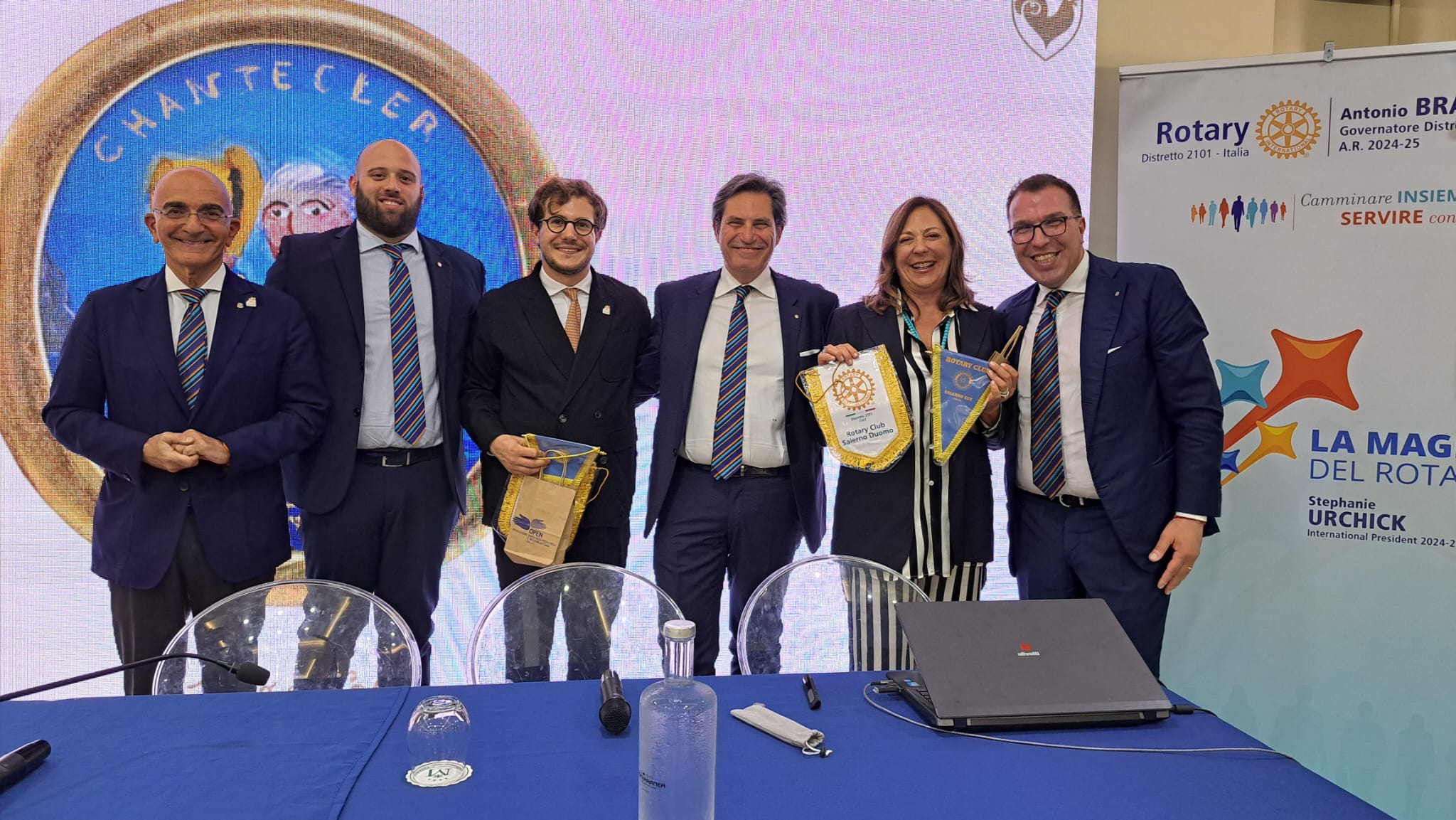 La campanella della “Chantecler”, da ottant’uno anni simbolo di Capri e simbolo di pace, un capolavoro di arte orafa, è stata la protagonista dell’incontro organizzato all’Hotel Mediterranea di Salerno dal “Rotary Club Salerno Est”, presieduto dal dottor Edoardo Ventura, in interclub con il “Rotary Club Salerno Duomo”, presieduto dal dottor Eduardo Grimaldi, e con il “Rotaract Club Salerno Est”, presieduto dal dottor Aldo Addesso. A raccontare la storia della campanella di Capri, gioiello iconico della” Chantecler”, il brand di alta gioielleria nato a Capri, che rappresenta la bellezza del Made in Italy, presentati dal socio del Club Antonio Capece, sono stati: la dottoressa Teresa Quisler Aprea e il giovanissimo nipote, il dottor Leonardo Logarin, figlio di Maria Elena Aprea Logarin.