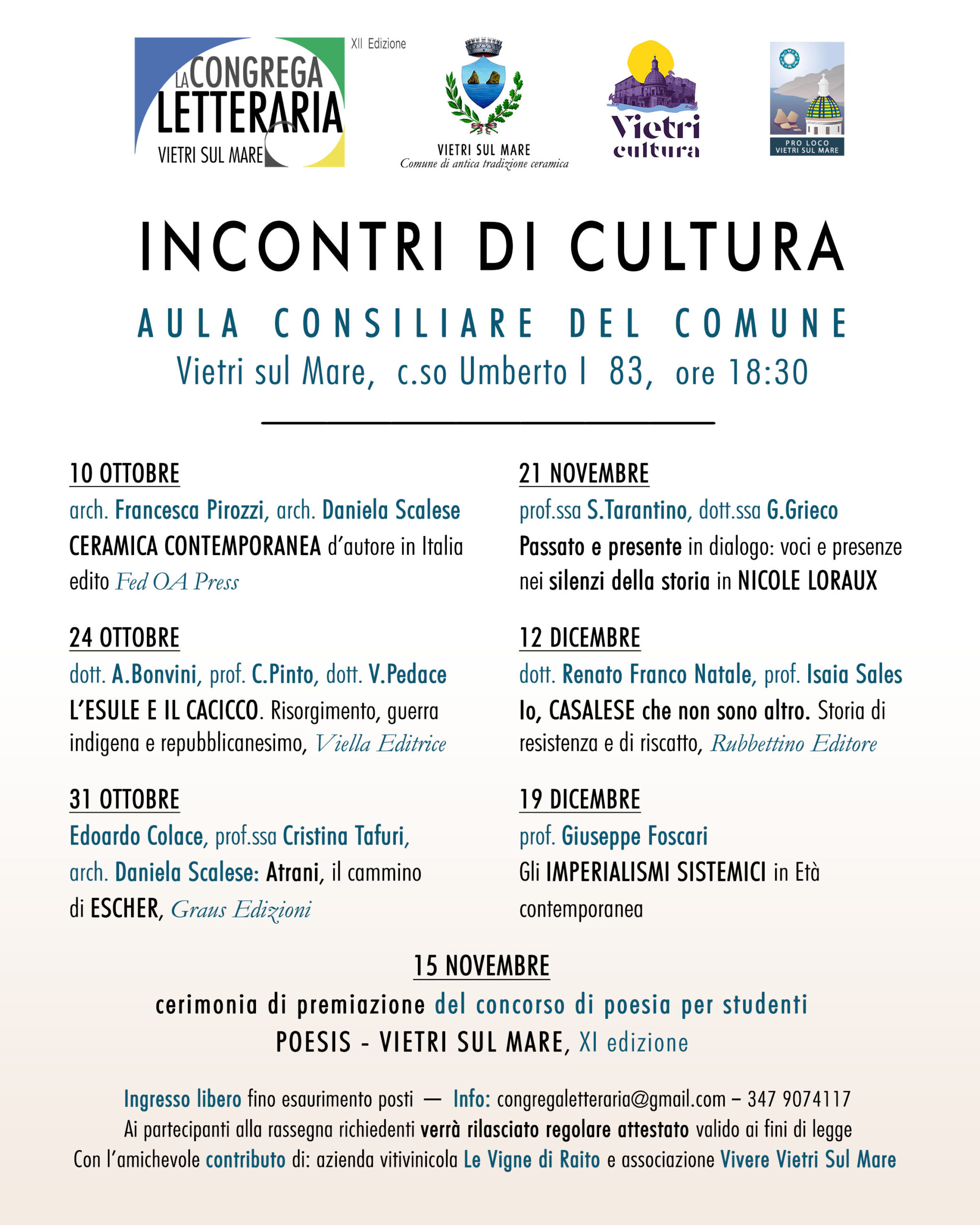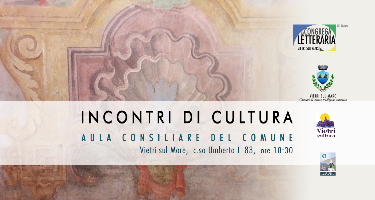L’associazione culturale La Congrega Letteraria, in collaborazione con il Comune di Vietri sul Mare e la Pro Loco Vietri sul Mare, è lieta di presentare il calendario di Incontri di cultura, XII edizione. Gli eventi, inseriti nella programmazione comunale “Vietri Cultura” si terranno presso la prestigiosa aula consiliare del comune, in c.so Umberto I 83, con inizio alle ore 18:30.