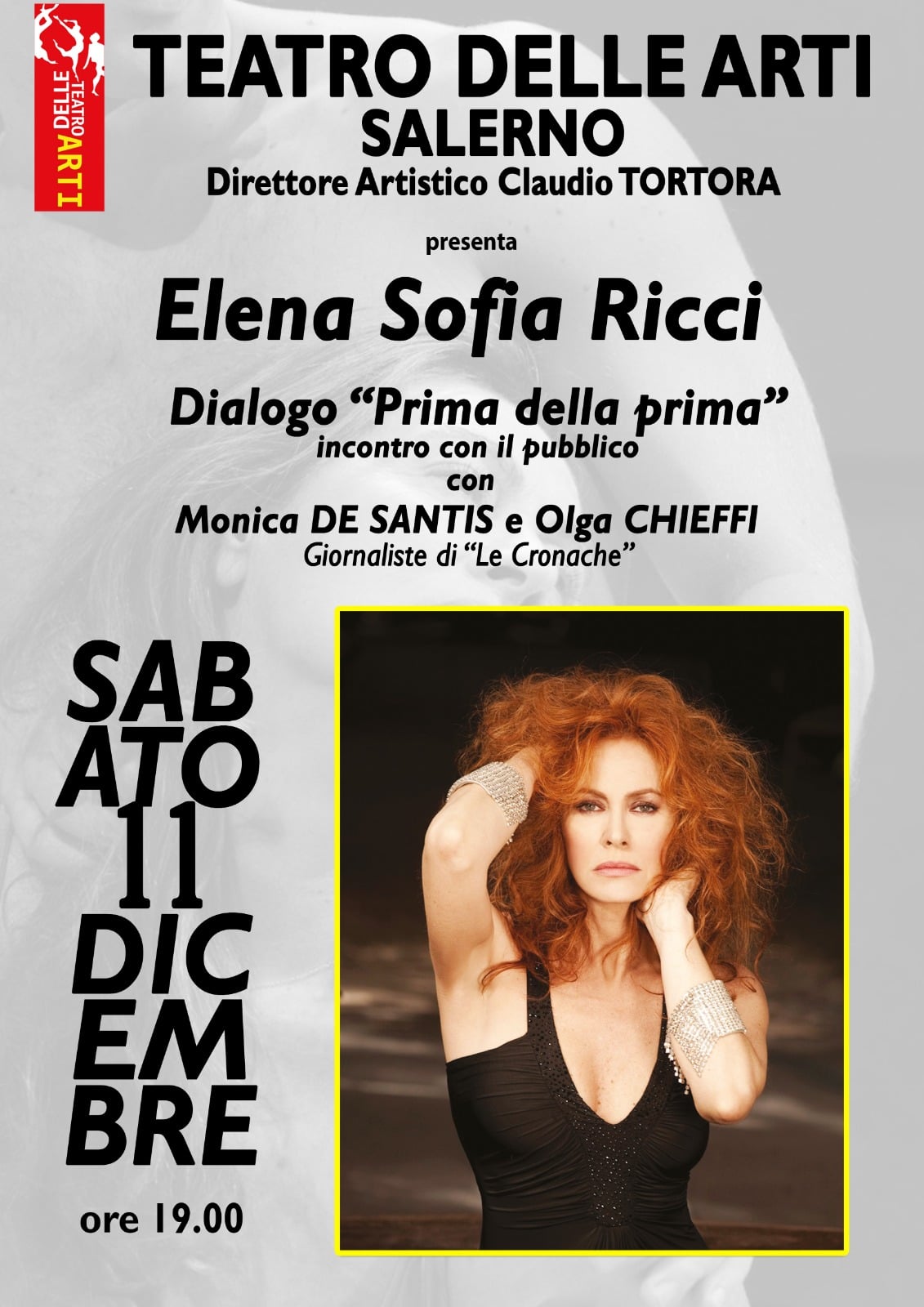 Sabato alle ore 19, con ingresso gratuito (fino ad esaurimento posti) al Teatro Delle Arti si terrà il secondo appuntamento con “Dialogo Prima della Prima”. Elena Sofia Ricci incontrerà e dialogherà con il suo pubblico. L’incontro sarà moderato dalle giornaliste Monica De Santis ed Olga Chieffi