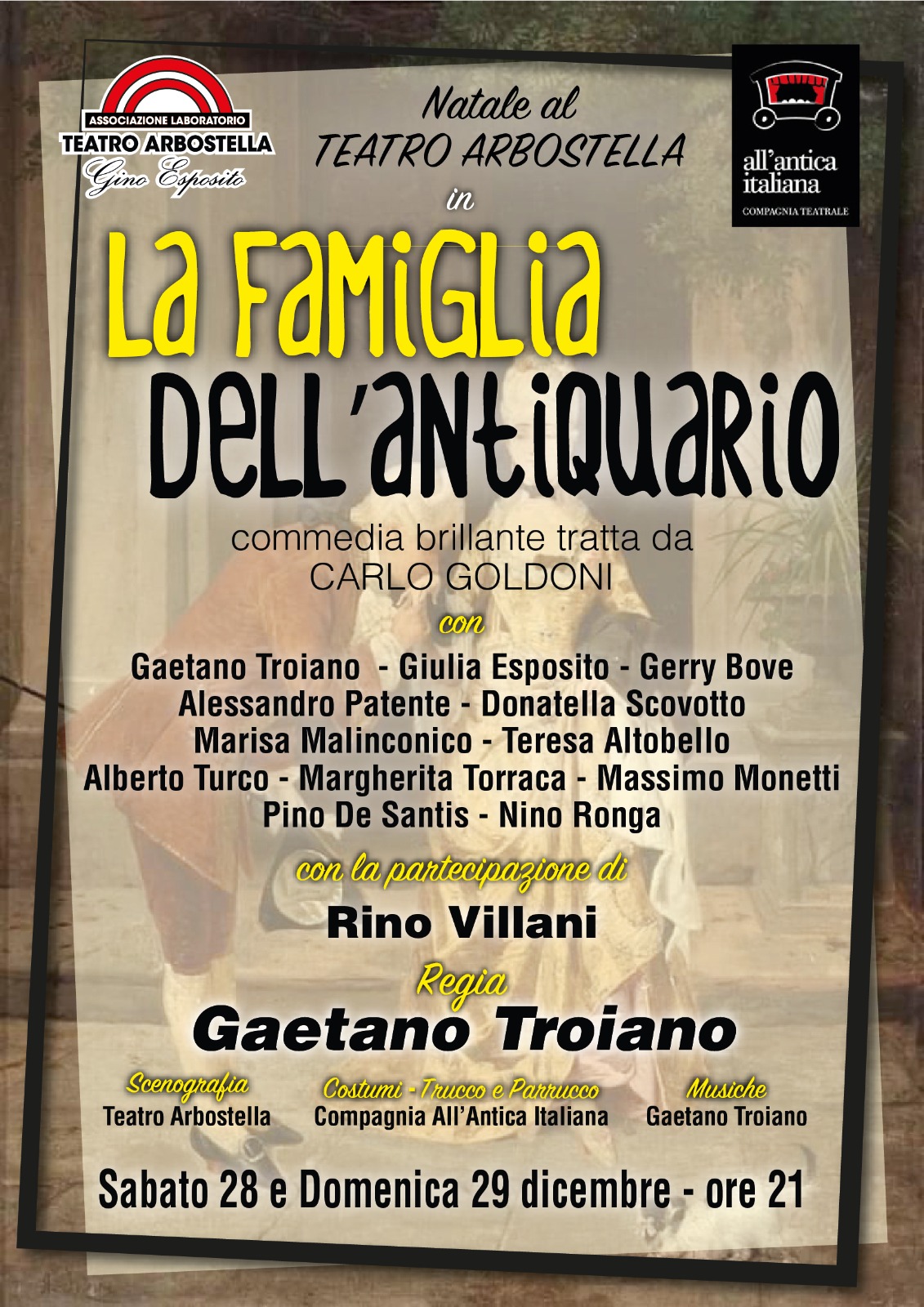 Appuntamento natalizio come ogni anno al Teatro Arbostella Gino Esposito di Salerno dove quest’anno, oltre ad eventi benefici e spettacoli per bambini, la direzione artistica firmata Esposito-Caracciuolo ha programmato per il 28 e 29 dicembre il brillante testo di Carlo Goldoni “La famiglia dell’antiquario” rivisitato in chiave comica dalla sapiente mano di Gaetano Troiano in scena con la sua compagnia dell’Antica Italiana.