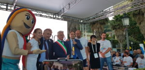 Presentati dal giornalista Marcello Festa, si sono alternati sul palco il Sindaco Vincenzo Napoli che ha sottolineato l’importanza storica dell’evento per la nostra città:” E’ un’occasione formidabile per Salerno e per tutta la Regione Campania: il Presidente De Luca è stato lungimirante. E’ una vetrina mondiale che presenta l’immagine migliore del Sud che cambia, che si rimbocca le maniche e vuole andare avanti diffondendo un messaggio di fiducia”. Le Universiadi sono partite da Salerno tre anni fa grazie alla proposta dell’avvocato Lorenzo Lentini, presidente del CUSI :” E’ la realizzazione di uno splendido sogno italiano. Devo ringraziare il Governatore Vincenzo De Luca che ce l’ha messa tutta. Ci abbiamo creduto fermamente e adesso stiamo cominciando a raccogliere i risultati”. Il dottor Leonz Eder, Primo Vice Presidente FISU , la Federazione Internazionale Sport Universitari, ha ricordato il motto dell’Università:” Oggi stelle, domani capi” e che Salerno:” Questa splendida città, sta vivendo un momento meraviglioso”. Anche il Presidente della Provincia, Michele Strianese ha sottolineato l’importanza dell’evento:” Nel nostro piccolo stiamo contribuendo a valorizzare un evento che rimarrà nella storia della nostra città e della nostra provincia. Dobbiamo essere orgogliosi di essere salernitani e campani”. Il Prefetto di Salerno, Vincenzo Russo, ha ricordato lo sforzo notevole messo in campo dalle forze dell’ordine per garantire la tranquillità e la sicurezza durante la manifestazione: ” Tanti giovani hanno il diritto di vivere in serenità questo momento straordinario delle Universiadi”. Il Commissario Straordinario dell’Universiade, Gianluca Basile, ha ricordato che sono stati stanziati 270 milioni di euro per organizzare la manifestazione sportiva: ” Questi eventi si riescono a fare solo se c’è un forte spirito di squadra”. L’Assessore allo Sport, Angelo Caramanno ha ricordato che anche lo Stadio Arechi è stato ristrutturato:” Grazie alla squadra del Comune, alla dottoressa Anna Maria Barbato, siamo riusciti ad essere pronti. Già prima dell’inaugurazione del 3 luglio, martedì, si disputeranno nel nostro stadio due partite importanti: Italia – Giappone, di calcio femminile e Italia – Messico, di calcio maschile. Le Universiadi lasceranno sicuramente un segno nella nostra città”. Anche il dottor Nello Talento, Consigliere Nazionale del CONI, ritiene che le Universiadi siano una grande opportunità: ” Dopo i 15 giorni delle Universiadi ci sarà l’opportunità, grazie ai 66 impianti sportivi ristrutturati che resteranno a disposizione delle nostre città, di cominciare a fare sport in modo adeguato nella nostra Regione”. Anche la Delegata Provinciale del CONI, Paola Berardino ha ricordato che le Universiadi sono un’opportunità unica per il nostro territorio:” Le Universiadi sono seconde solo alle Olimpiadi. Questo passaggio della fiaccola è simbolo di coesione, di pace e di fratellanza tra i popoli”. La campionessa olimpica di sci di fondo, Manuela Di Centa, che fa parte del Comitato Organizzatore, è rimasta affascinata dalla nostra città :” Il fuoco dell’Universiade è il fuoco dello sport e della cultura: Salerno rappresenta nel mondo dello sport e dell’Università un’eccellenza”. Sul palco sono saliti anche il Sindaco di Baronissi Gianfranco Valiante, il Vicesindaco del Comune di Fisciano, Maria Grazia Farina, l’Assessore allo Sport del Comune di Eboli Giancarlo Presutto, che ha ricordato che al “Palasele” si giocheranno le gare di pallavolo, e gli assessori del Comune di Nocera e del Comune di Cava De’ Tirreni. Presente anche il Rettore dell’L’Università di Salerno, Aurelio Tommasetti che ha ricordato che a Baronissi, sono stati realizzati tre nuovi palazzetti:” Con quello esistente e con la nostra grande palestra saremo in grado di far disputare tutte le gare di scherma e la finale. Nel Campus di Fisciano abbiamo creato il “Villaggio degli Atleti” che ospiterà 1048 atleti”. Presenti anche il Vicepresidente Vicario del Coni Regionale e presidente del Comitato Regionale Feder Scherma Campania, Matteo Autuori, il Direttore del CUS di Salerno Michele Di Ruocco, il dottor Piero De Luca, il Presidente della Camera di Commercio Andrea Prete, l’Assessore Maria Rita Giordano, il Consigliere Regionale Franco Picarone, il Consigliere Giovanni Coscia, il Consigliere Comunale Horace Di Carlo, il Consigliere Regionale Tommaso Amabile, l’Assessore Mimmo De Maio, l’Assessore Gaetana Falcone, e l’amministratore di Salerno Solidale Filomena Arcieri. Colonna sonora della serata, che sarà anche quella delle Universiadi, è stato il brano pop – rap “Glory” scritto dal compositore napoletano Stefano Gargiulo.