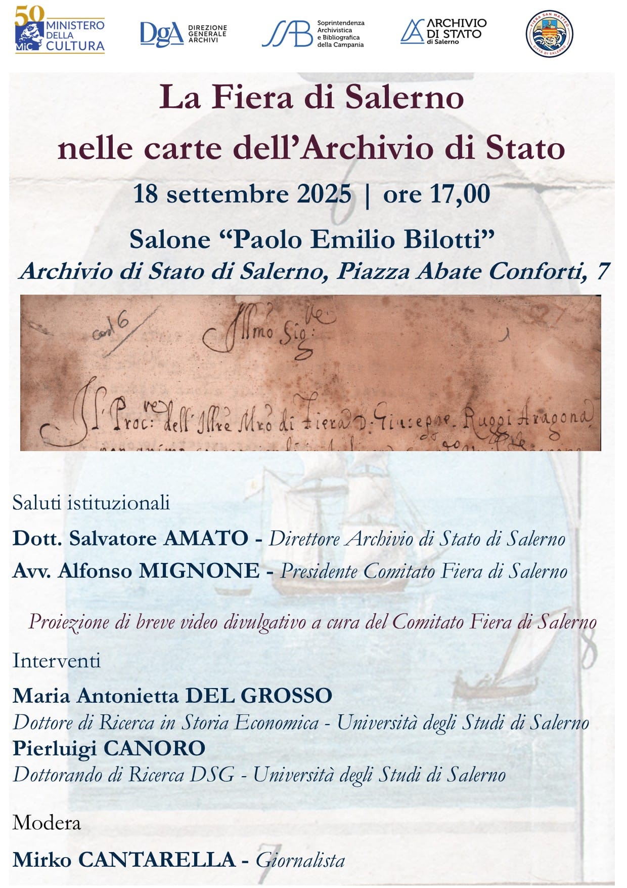 Giovedì 18 settembre 2025, alle ore 17,00, presso il Salone “Paolo Emilio Bilotti” dell’Archivio di Stato di Salerno, si terrà il convegno “La Fiera di Salerno nelle carte dell’Archivio di Stato”.