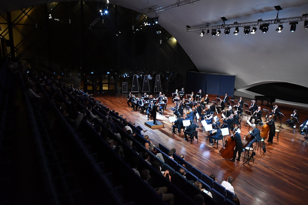 Marco Armiliato e i 44 elementi del San Carlo accompagnati nella Città della Musica dal sovrintendente Stéphane Lissner, nel pomeriggio avevano provato sul Belvedere ma i nuvoloni neri che incombevano alle loro spalle non lasciavano presagire niente di buono e infatti… poco prima dell’inizio del concerto il forte temporale ha imposto lo spostamento.