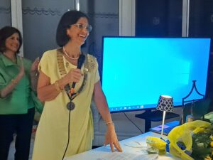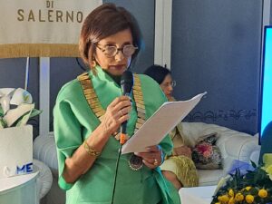 La dottoressa Emma Magaldi Paolillo ha ringraziato tutte le componenti del suo Consiglio Direttivo e ricordato le tante iniziative organizzate durante il suo anno di presidenza, con la collaborazione di tutte le socie:” Arte in Terrazza” è stato il primo evento organizzato insieme ai Club Rotary e Inner Wheel del territorio per raccogliere fondi a favore di associazioni di solidarietà, grazie al Maestro Livio Ceccarelli che ci ha consentito di mettere all’asta cinque sue opere. Grazie alla sinergia creatasi con la direzione artistica del “Teatro delle Arti”, e alla collaborazione della “Compagnia dell’Arte di Valentina Tortora e Alessandro Ronga, sono stati rappresentati cinque spettacoli teatrali alla fine dei quali i bambini delle scuole primarie, destinatari del progetto “Sogni & Realtà”, hanno preparato degli elaborati che avevano come tema la trama dello spettacolo messo in scena. Successivamente i bambini, insieme alle loro famiglie, hanno partecipato a degli incontri di ascolto con la dottoressa Antonietta Grandinetti, psicologa, che li ha guidati e stimolati a presentare i loro lavori. Quest’anno abbiamo anche festeggiato, a Salerno, il 99mo compleanno dell’International Inner Wheel Day con la partecipazione di tante socie del “Distretto 210” presieduto dalla Governatrice Elena Antonacci. In quell’occasione è stato anche destinato uno spazio a cinque imprenditrici del territorio che hanno saputo valorizzare le risorse agricole campane, l’arte della gioielleria e il talento fotografico. Ci siamo occupate anche del conflitto tra Russia e Ucraina invitando la dottoressa Nona Mikelitze e il professor Carmine Pinto e, successivamente, attivandoci per far pervenire generi di prima necessità a un centro di accoglienza in Ucraina. Interessante anche la conversazione sul tema dell’Ambiente e dell’inquinamento atmosferico tenutasi al “Circolo Canottieri Irno” con il Cavaliere Mario Magaldi, presidente della “Magaldi Green Energy”, e con l’ingegnere Simone Savastano del “Gruppo Magaldi” che hanno illustrato una innovativa tecnologia capace di trasformare l’energia prodotta dagli impianti fotovoltaici in energia termica riutilizzabile tramite accumuli in materiali solidi come la sabbia”. La Presidente Nazionale Incoming Maria Andria Pietrofeso, ha annunciato che nel mese di gennaio del 2024 sarà celebrato il centenario della fondazione dell’Inner Wheel:” Converranno a Salerno i più importanti rappresentai di questo antico e prestigioso sodalizio che arriveranno da tutta l’Italia”. La presidente Le Rose, ha presentato il nuovo Comitato Esecutivo: Vice Presidente Daniela Vessa Pezzuto; Immediate Past President Emma Magaldi Paolillo; Segretaria Marcella Petraglia Anzolin; Tesoriere Diana Di Lorenzo Sardone; Addetta Stampa Gina Cioffi Visciani; Addetta al Servizio Internazionale Maria Maddalena Russo. Consigliere: Laura Camisa Colombis, Marisa Della Monica Fiorillo, Anna Maria Malinconico Grimaldi, Rosa Ranieri Pepe, Luisa Marinato Pellegrino, Mariapia Scarpa Mazzella. Delegate al Distretto: Pierina De Giorgi Lerose, Marianna Blasi Bortone. Delegate Supplenti al Distretto: Nunzia D’Aniello Mirra, Prosperina Trani Gallotti. Responsabile Internet: Marianna Sprocati Fiocco. La colonna sonora della serata è stata affidata alla pianista Marida Niceforo che ha proposto brani classici della musica italiana e straniera ed anche alcune canzoni classiche napoletane. Tra i tanti presenti vi erano la Past Board Director Internazionale, Bettina Lombardi Crisci e i presidenti dei Club Rotary e Inner Wheel del territorio.