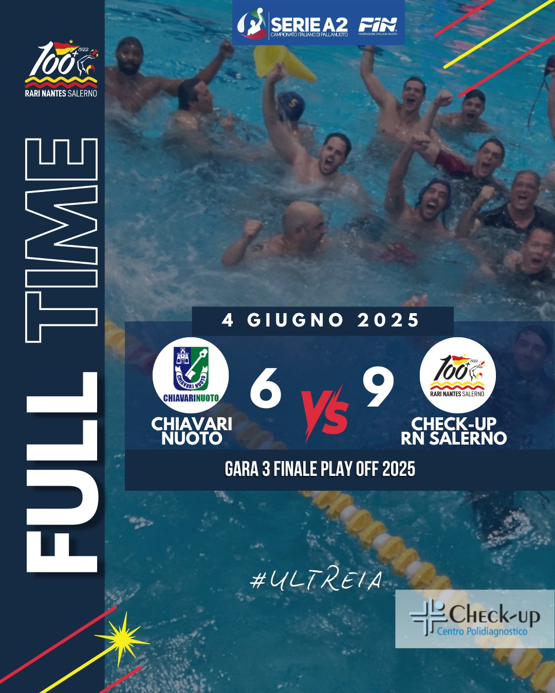Dopo una sola stagione di purgatorio in Serie A2, la Rari Nantes Salerno riabbraccia il sogno della Serie A1. Lo fa al termine di un percorso intenso, combattuto e carico di emozioni, culminato nella vittoria decisiva sul campo del Chiavari Nuoto nella “bella” dei playoff promozione. Un successo che va oltre il risultato sportivo: è il coronamento di un percorso di riscatto, volontà e coesione, che ha riportato in alto il nome della pallanuoto salernitana.