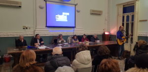 Il musicista Matteo Cantarella ha cantato alcuni brani che hanno richiamato le atmosfere raccontate nel libro di Gravagnuolo che ha ricordato la Salerno di alcuni anni fa attraverso i luoghi caratteristici della nostra città come Piazza Flavio Gioia, da tutti chiamata ”La Rotonda”, apprezzata negli anni ’60 anche da Giuseppe Prezzolini, dove ogni mattina, tra le voci urlanti, si teneva il mercato e dove arrivavano anche le donne con la cesta in testa per vendere i loro prodotti. L’ha ricordata anche attraverso personaggi che tutti hanno conosciuto come la signora delle Poste , con le labbra truccate di colore rosso, la Suora del Capitol, Spic e Span. Alcuni racconti sono dedicati anche a: Donato Vestuti, al quale è stato dedicato lo stadio di Piazza Casalbore; alla Festa di San Matteo; all’Alzata del Panno, che vedeva coinvolte alcune piazze come Largo Campo e Piazza Amendola. Gravagnuolo nel suo libro ricorda anche la nevicata del ’56 a Salerno; la nascita, negli anni ’60, del Bar Nettuno, sul Lungomare, che diventò il punto di riferimento dei giovani “nettuniani” e dove, il 21 settembre del 1975 nacque il primo gruppo Ultras d’Italia. Tanti altri sono i bar citati da Gravagnuolo: il Bar Ponte, il Bar Varese, punto di ritrovo della “Salerno bene”, il Bar Venezia, frequentato anche da un ambulante che vendeva “’i lent po’ sol’ ‘i lent pa’ vista”, il Bar Tafuri, il Bar Roma, il Bar Nazionale, il Bar Cannavale, l’unico ad avere la macchina per il gelato Carpigiani, il Bar Massimo a Torrione, che era quello con più flipper a Salerno. Gravagnuolo ricorda anche i cinema che non ci sono più: il Metropol, il Capitol, dove si giocava la schedina il sabato sera, l’Astra, l’Augusteo, il Vittoria, il Diana, il Modernissimo, il Mini, inaugurato nel 1973, e l’ Apollo di Via Vernieri, l’unico ancora rimasto in città. Gravagnuolo ricorda anche di quando i giovani di ritorno dalle discoteche della Costiera, si fermavano a mangiare la zeppola a Molina di Vietri e alcuni dei ristoranti e delle pizzerie più frequentate: il “Vicolo della neve”, “Il Fusto d’Oro”, la ”Pizzeria dello Sport”, chiamata da tutti la pizzeria del Gobbetto, dove con 350 lire si compravano pizza e birra. Gravagnuolo ricorda anche la bancarella delle caramelle veneziane sul Corso Vittorio Emanuele, davanti al negozio “Singer” e l’apertura, nel 1966, del primo pub a Salerno, il “Caffè dei Mercanti” che accoglieva i ragazzi del Circolo Universitario “La Scacchiera” di Palazzo d’Avossa, ma anche importanti intellettuali come Achille Bonito Oliva, Alfonso Gatto e il pittore Tafuri. Tanti i momenti importanti vissuti dai salernitani come quello, nel 1964,dell’arrivo a Salerno de “Il Cantagiro”, con Gianni Morandi, Little Tony, Gino Paoli, presentati da Enrico Maria Salerno e Pippo Baudo. Gravagnuolo dedica ampio spazio all’arrivo a Salerno, alla fine del 1975, delle radio libere e private: Radio Salerno 1, Radio Salerno City, Radio Alfa, Radio Panorama, Radio Tris, Radio Gamma, Radio Stella, Radio Onda Libera. Gravagnuolo ha ricordato anche i modi di dire più usati alcuni anni fa:” Le persone che abitavano a Torrione o a Pastena, sulla filovia, al bigliettaio che staccava il biglietto che costava 40 lire dicevano “Vac’ a Saliern”. Aniello Palumbo