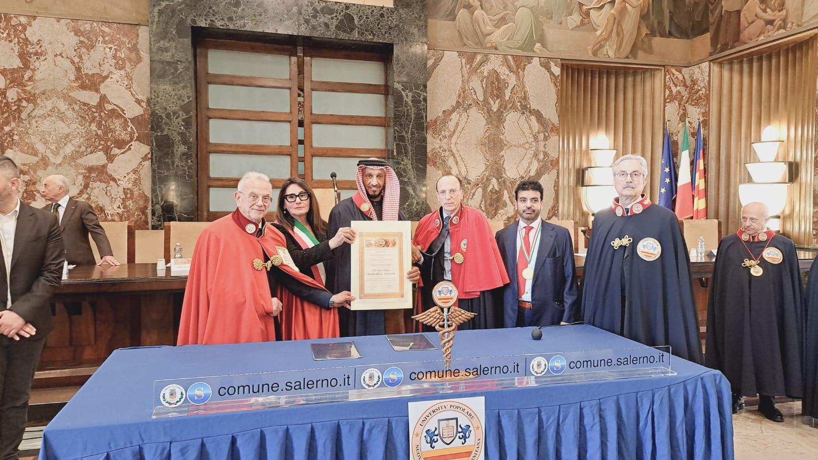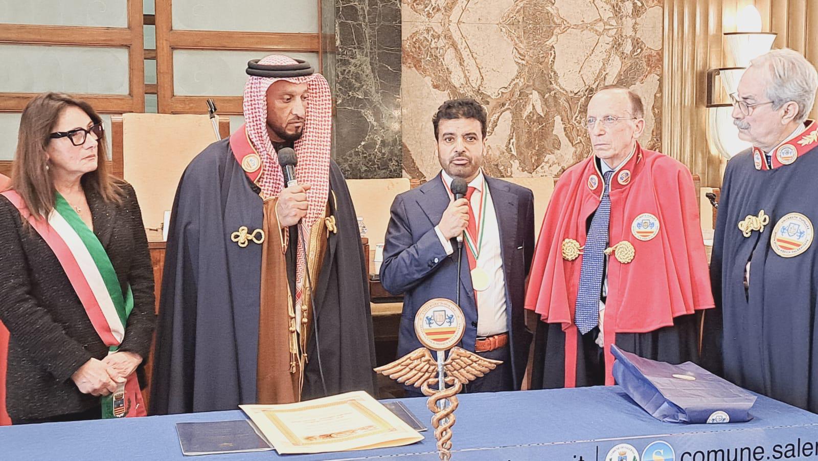 Nel corso della cerimonia, lo Sceicco Abdulla Mohamed Butti Alhamed ha ricevuto l’ambito Premio Internazionale Scuola Medica Salernitana per la Cooperazione dei Popoli, in riconoscimento del suo costante impegno nella promozione della solidarietà umana e della cooperazione internazionale. A suggello di questa importante visita, l’Almo Collegio della Scuola Medica Salernitana lo ha insignito del titolo di Magister Honoris Causa per le Scienze Umane e la Cooperazione dei Popoli e lo ha accolto ufficialmente tra i suoi membri.
