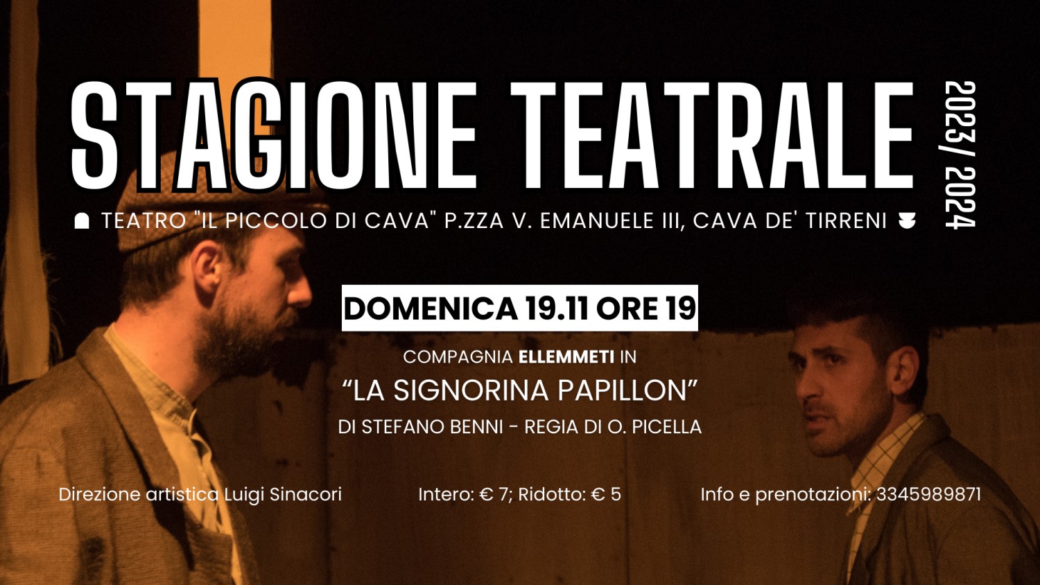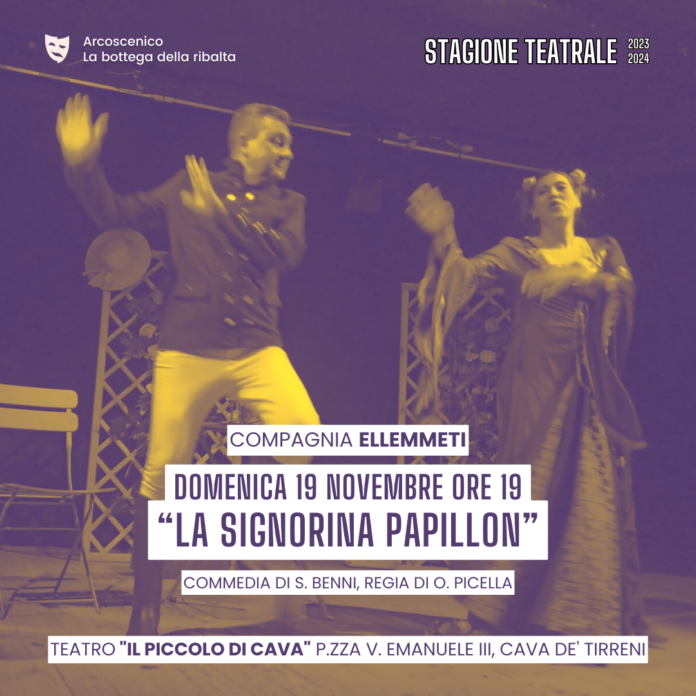 Domenica 19 novembre dalle 19, al Teatro Il Piccolo di Cava in p.zza V. Emanuele III, prosegue la Stagione Teatrale 2023/2024 organizzata dall’Associazione Arcoscenico. Dopo il successo del primo doppio appuntamento con la compagnia di casa ad inaugurare questa edizione, Cava de’ Tirreni ospiterà la compagnia ELLEMMETI (Libera Manifattura Teatrale) di Napoli. In scena La Signorina Papillon, commedia di Stefano Benni surreale e coinvolgente, con la regia di Orazio Picella ed interpretata, oltre dallo stesso Picella, da Jenny Brascio, Dino D’Alessandro e Simona Pisani.
