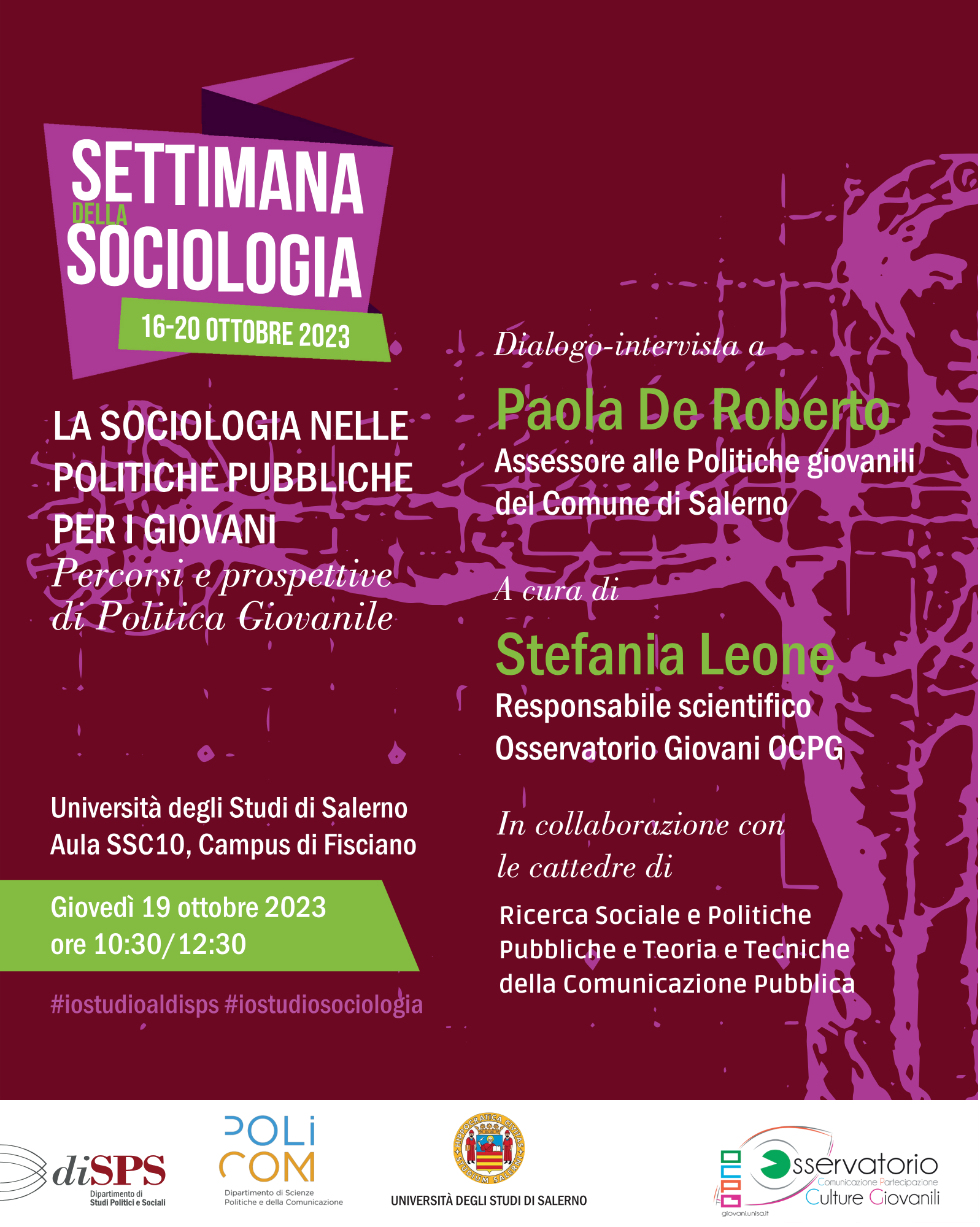 Mercoledì 19 ottobre 2023 dalle ore 10.30 alle ore 12.30 presso l’aula SSC10 dell’Università degli Studi di Salerno, nell’ambito della “Settimana della Sociologia” organizzato dall’ Osservatorio Giovani OCPG del dipartimento di Scienze Politiche e della Comunicazione UNISA, e in collaborazione con le cattedre di: Ricerca Sociale e Politiche Pubbliche e Teoria e Tecniche della Comunicazione Pubblica , si terrà il seminario “La sociologia nelle politiche pubbliche per i giovani”