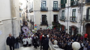 Il dottor Gravagnuolo ha raccontato che la processione di San Matteo per circa un decennio non fu organizzata: ”Il Sindaco Matteo Luciani, eletto nel 1862 , decise che le processioni non potessero più percorrere le strade cittadine. Tutti i riti religiosi si svolgevano solo all’interno delle chiese. Riuscirono a far uscire nuovamente la processione “le fornellesse”, le donne del quartiere Fornelle, che nel 1873, rubarono le chiavi della Cattedrale del Duomo e fecero uscire le statue, alle sei del mattino, portate in spalla dai loro figli, su paranze adattate al momento da alcuni falegnami. Fu una processione rivoluzionaria. Matteo Luciani a quel punto si arrese e da allora la processione si è sempre fatta”. Gravagnuolo, che ha effettuato ricerche negli archivi storici e nelle biblioteche e studiato testi scritti da personaggi salernitani come l’avvocato Orila, ha ricordato anche il periodo del colera del 1837 che colpì Salerno provocando 1197 morti :” In quell’anno venne organizzata una processione penitenziale, che non venne fatta il 21 settembre, organizzata anche grazie alla volontà dell’Amministrazione Comunale di Salerno che emise una delibera che così recitava:” Forza umana non può schivare, altro scampo non rimane che il soccorso del Cielo”. Dopo la processione scomparve il colera a Salerno”. Gravagnuolo ha anche spiegato che l’alzata del panno nel passato non si faceva nell’atrio del Duomo, ma ogni anno in una piazza diversa di Salerno:” Di solito veniva scelta Piazza Largo Campo o quella davanti alla Chiesa di Santa Lucia: raramente Piazza Portanova”. Gravagnuolo ha anche raccontato che cento anni fa la Festa di San Matteo durava due giorni:” Una folla oceanica partecipava alla festa. Venivano organizzati terni speciali per consentire alla gente di arrivare a Salerno. Il giorno dopo la processione del 21 rimanevano le bancarelle ed anche i fuochi venivano ripetuti”. Aniello Palumbo