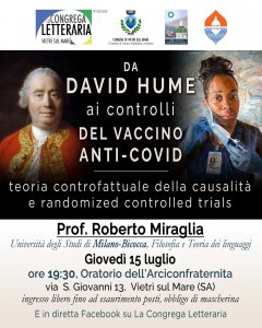 Come funzionano i controlli sull’efficacia dei vaccini? Su quali teorie filosofiche si basano? A spiegarlo sarà il Professor Roberto Miraglia, Professore Associato di Filosofia e Teoria dei Linguaggi presso l’Università degli Studi Bicocca di Milano, durante la sua “Lectio Magistralis” dal titolo : “Da David Hume ai controlli del vaccino Anti Covid: teoria controfattuale della causalità e Randomized Controlled Trials “che terrà domani sera (giovedì 15 luglio), alle ore 19,30, presso lo storico e suggestivo oratorio dell’Arciconfraternita del SS. Rosario e SS. Annunziata di Vietri Sul Mare, in occasione del quarto degli “Incontri di Cultura” organizzati dai direttori artistici de “La Congrega Letteraria” di Vietri sul Mare, Antonio Gazia e Alfonso Vincenzo Mauro, con il sostegno e la collaborazione dell’Amministrazione Comunale e della Pro Loco di Vietri sul Mare. Il Professor Roberto Miraglia, che ha anche insegnato all’Università degli Studi di Salerno e Firenze, spiegherà cosa sia la causalità: il nesso, il rapporto tra causa ed effetto e la nozione controfattuale di causalità che rappresenta uno dei prodotti della riflessione filosofica più influenti nella società contemporanea. Adottata nell’analisi dei fenomeni storico-sociali e nelle indagini statistiche è, per esempio, quella esplicitamente utilizzata per accertare in ambito processuale le responsabilità civili e penali. La lezione di Filosofia della Scienza analizzerà questa nozione in riferimento alle sue afferenze squisitamente scientifiche e attuali, come i recenti controlli per lo sviluppo dei vaccini anti-covid. A questo proposito il professor Miraglia, dopo aver confrontato la teoria di causalità del filosofo, empirista e illuminista scozzese David Hume, con quella del filosofo americano David Lewis, spiegherà il funzionamento e l’efficacia, nell’ambito dei vaccini, dello studio controllato randomizzato “Randomized Controlled Trials (RCT) ” che ha previsto lo studio di due gruppi di persone: quello terapeutico, nel quale un certo numero di persone ha ricevuto il trattamento del vaccino e quello di controllo nel quale altre persone hanno invece ricevuto il trattamento placebo.