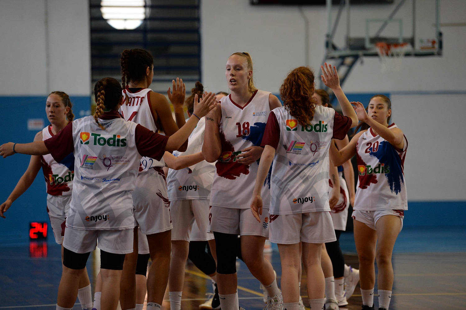 LA PARTITA. Cragnolino sblocca con un tiro aperto su assist di De Mitri dal fondo. Un colpo alla schiena limita però subito Duran, out per quasi tutto il primo quarto. Pareggia David e sono gli unici canestri nei primi 3’:30”. Toni agonistici alti fin dall’inizio, vista l’elevata posta in palio. Maggi porta Capri avanti, Cragnolino riprende, ma Salerno sbaglia troppo in attacco e le ospiti – con Rios e Dacic – strappano a +6 (4-10). Timeout Russo a 3’ dal primo intervallo, ma le ospiti allungano: Salerno costruisce, arriva bene al tiro ma la mira non è delle migliori, a dispetto di una difesa comunque non malvagia contro una campionessa internazionale come Dacic. Sarà così fino al termine, con percentuali troppo basse rispetto agli standard. Gallo si accende dall’angolo per la tripla del 6-15; rientra Duran e accorcia a poco prima dello stop. Il secondo quarto si apre con lo strappo firmato Dacic, David e Rios: 8-21 del 13’. Salerno accusa, ma resta tenace, anche se si vede sputar fuori dal canestro molti tentativi. Orchi e Cragnolino sono caparbie, ma il bonus falli scatta presto in favore delle ospiti, che si presentano con costanza dalla lunetta, arrivando fino al +19 del 27’ (16-35). Sestito e De Mitri (che interrompe la maledizione dei tiri da tre e insacca a 1’:30” dall’intervallo lungo) rosicchiano: si va al riposo sul 23-38. Todis rigenerata al rientro. Segna Van der Linden, la imita Duran in due occasioni: -9 e gran carica. Capri segna al 24’ con Dacic (30-40) e la partita si infuoca. Salerno, tuttavia, spende tante energie ed è inevitabilmente poco lucida nel momento di accelerazione massima. Alle azzurre interessa rallentare i ritmi, alle granatine sprintare. Maggi-Dacic per il +16 di Capri al 27’ (32-48), Valerio insacca la tripla del 41-52 a pochi centesimi di secondo dal 30’. Ma Salerno si disunisce proprio nell’ultimo periodo, che comincia col parziale di 0-6. La tripla della solita Gallo scrive la fine, con le ospiti a +20 a 6’ dalla sirena. Finisce 55-83 con il nervosismo alle stelle e il duo Manganiello-Argenio in confusione a match già abbondantemente orientato.