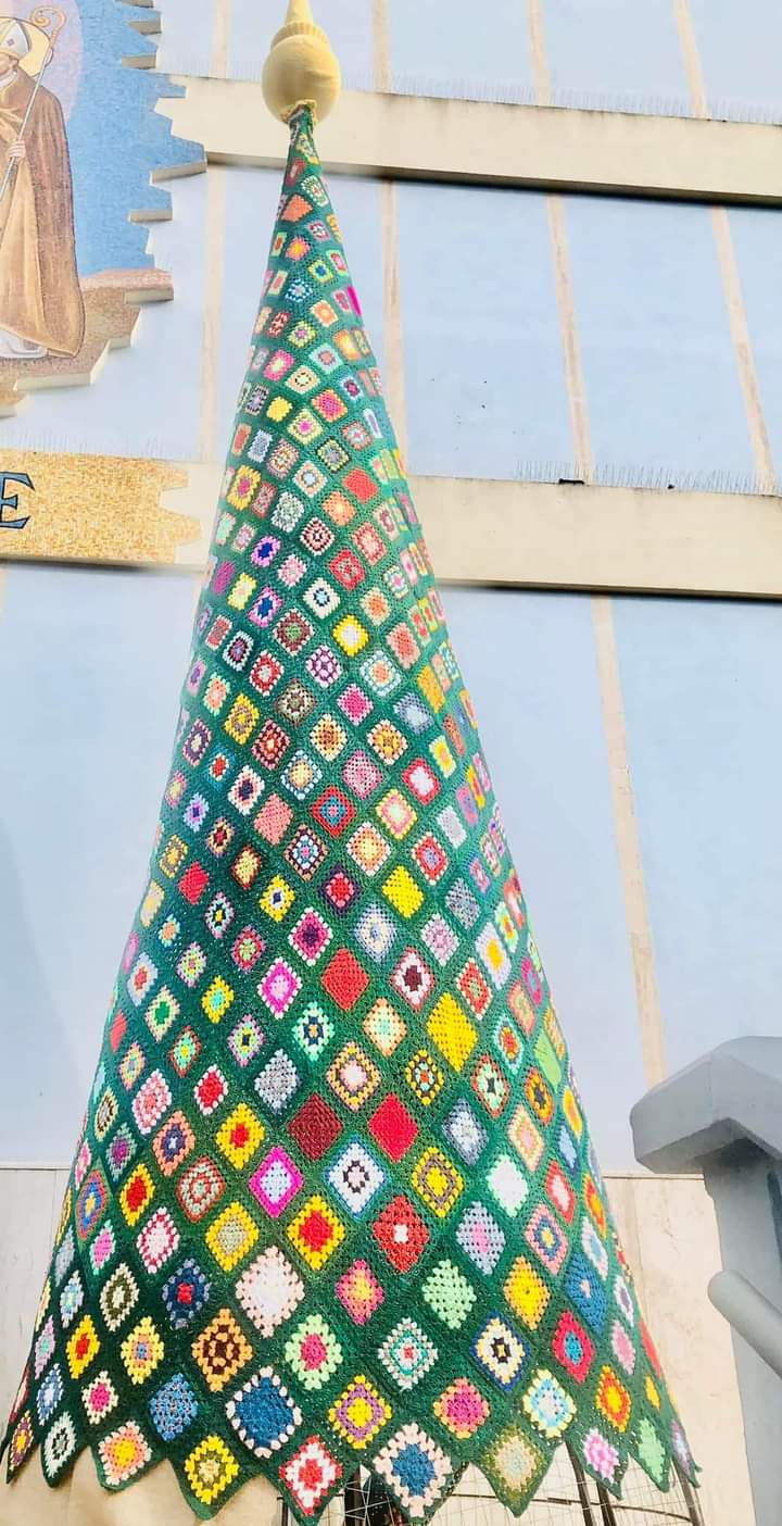 Punto dopo punto, maglia dopo maglia, è stato innalzato un albero di 6,50 metri di altezza, per una larghezza di due metri. È composto da 1200 quadrati, le classiche mattonelle con cui le nostre nonne creavano coperte.