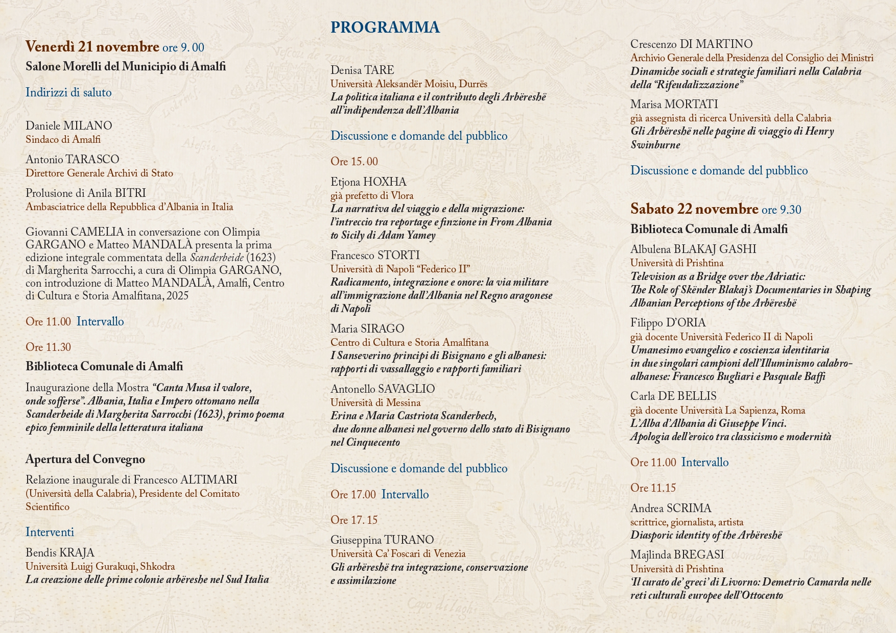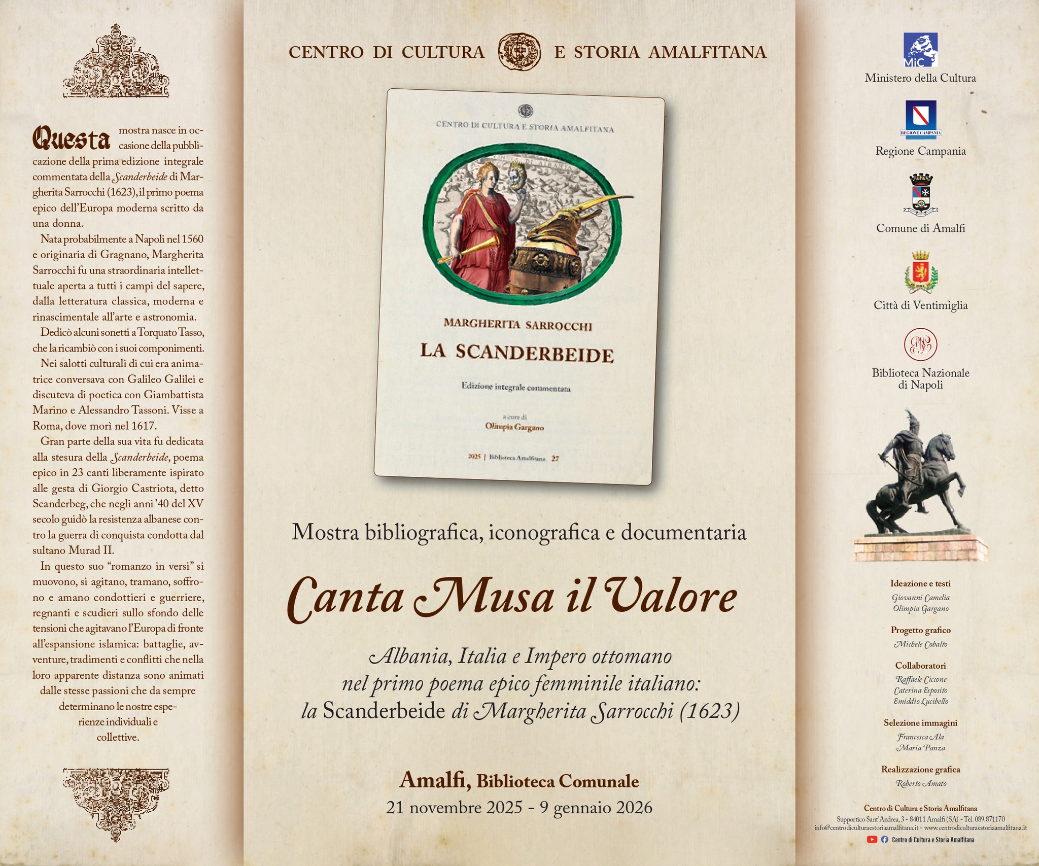 A sottolineare l’importanza dell’evento, dal 21 novembre 2025 al 9 gennaio 2026 la Biblioteca Comunale di Amalfi ospiterà la Mostra Canta Musa il Valore. Albania, Italia e Impero ottomano nel primo poema epico femminile italiano: la Scanderbeide di Margherita Sarrocchi (1623) che vedrà l’esposizione delle due seicentine originali provenienti dalla Biblioteca Aprosiana di Ventimiglia e dalla Biblioteca Nazionale di Napoli.