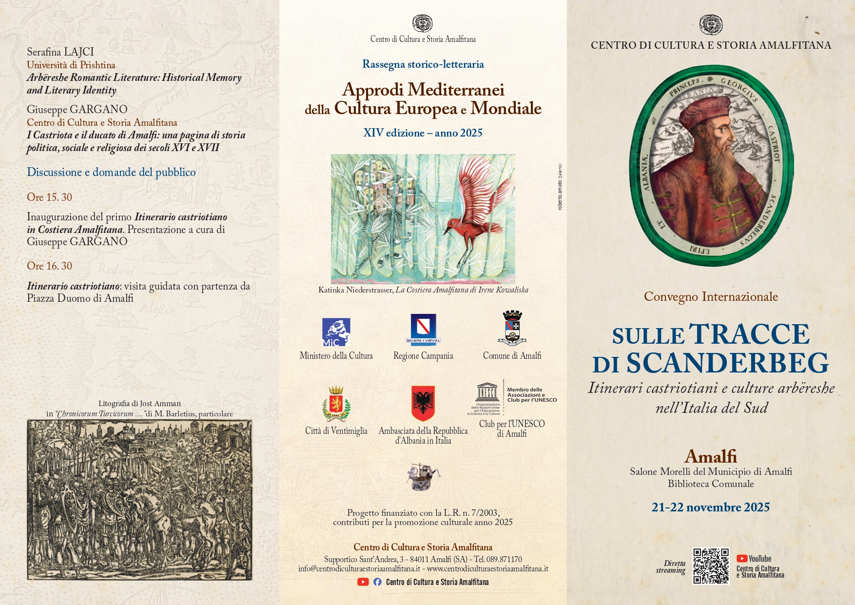Al termine del Convegno, sabato 22 novembre nella Biblioteca Comunale di Amalfi, alle ore 15.30, sarà presentato il primo Itinerario castriotiano (Amalfi – Scala – Nocera Inferiore) a cura di Giuseppe Gargano; a seguire, alle 16.30, con partenza da Piazza Duomo, il Prof. Gargano accompagnerà i partecipanti alla scoperta dei luoghi castriotiani amalfitani.