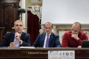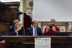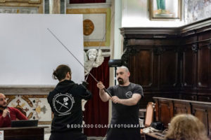 Nel corso della serata si è parlato anche di scherma moderna o sportiva con il dottor Antonio Sanges, noto dottore commercialista salernitano, dirigente del “ Club Scherma Salerno” e presidente della “Polisportiva Salernitana Sporting”, famoso schermidore salernitano che ha conquistato con i colori della storica associazione “Nedo Nadi” la semifinale della Coppa del Mondo di spada:” Era la Coppa del Mondo Mannino a Catania. Per me fu una grande emozione combattere contro i più grandi atleti tedeschi e svedesi. Indossare la tuta dell’Italia è stato per me motivo di grande orgoglio. Conservo gelosamente la coppa che vinsi in quell’occasione”. Il dottor Sanges ha spiegato che oggi, rispetto alla scherma antica, il modo di fare scherma è completamente diverso :” A livello atletico la scherma oggi è più dinamica e aperta anche se molte delle tecniche di combattimento della scherma antica sono state antesignane della scherma moderna. La scherma oggi è lo sport più medagliato alle Olimpiadi. Purtroppo di questo sport come di molti altri, come il canottaggio, il nuoto e la pallanuoto, ce ne ricordiamo soltanto nel periodo delle Olimpiadi. Lo sport è cultura di base: è fondamentale ed importante per migliorare la qualità della vita, per allontanare i giovani da tanti intrattenimenti negativi e da tante problematiche”. (FOTO DI EDOARDO COLACE)