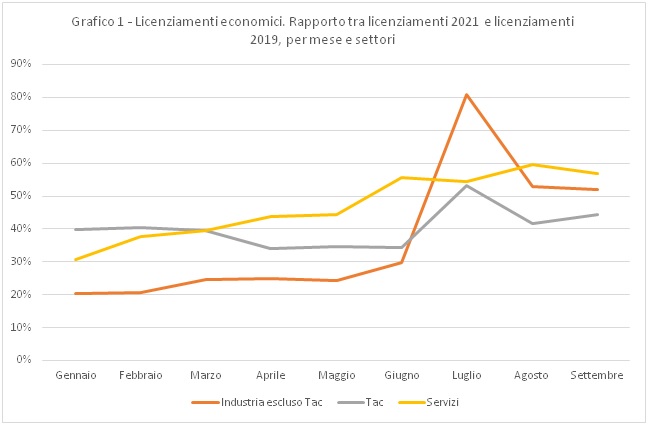 Si osserva che nel mese di luglio 2021 nell’industria (escluso Tac) il numero di licenziamenti registrati si è significativamente avvicinato al livello del 2019 (da un rapporto continuo, per i mesi precedenti, attorno al 20-30% si è saliti all’80%) ma non l’ha comunque raggiunto e nei successivi mesi di agosto e settembre non si è affatto verificato un ulteriore avvicinamento.