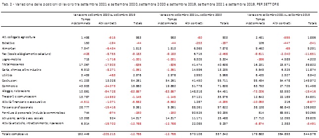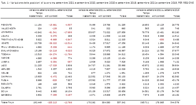 Confrontando la situazione a settembre 2021 con settembre 2019 registriamo un saldo decisamente positivo per i rapporti di lavoro a tempo indeterminato (+366.000: si sommano risultati positivi sia per la prima che la seconda annualità considerata); anche per l’insieme delle altre tipologie contrattuali a livello biennale il saldo risulta marcatamente positivo (+179.000) con il pieno recupero della perdita che era stata registrata tra settembre 2020 e settembre 2019 (-205.000).