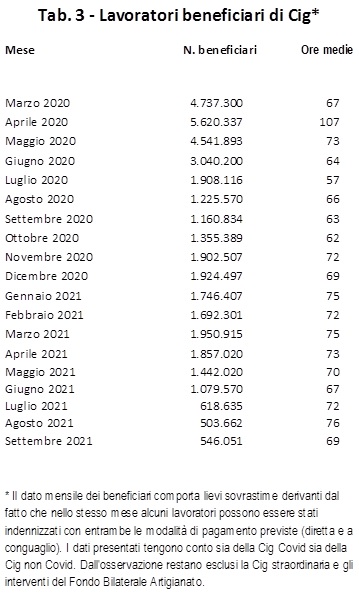 I dati riportati in tab. 3,[1] che aggiornano analoghe elaborazioni presentate nel recente Rapporto annuale, evidenziano come nel corso dell’anno si sia sviluppato il processo di riassorbimento della Cassa integrazione: a marzo i lavoratori in Cig risultavano ancora poco meno di 2 milioni con una media pro capite di 75 ore (nel mese osservato); a settembre risultavano pari a circa 550.000 unità con una media di 69 ore pro-capite.