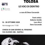 Venerdì 16 Ottobre 2020, presso la Chiesa di san Severo al Pendino, via Duomo 286 – Napoli, si inaugura alle 17,00 la personale d’arte contemporanea di Nicholas Tolosa con il patrocinio del Comune di Napoli e dell’ Osservatorio Comunicazione Partecipazione Culture Giovanili (OCPG) dell’Università di Salerno. La mostra, a cura di Dora Caccavale con testi critici di Roberto Sottile, Luca Ricci e Dora Caccavale, si intitola “Le voci di dentro”. Fino al 30 ottobre, dal lunedì al venerdì dalle 9 alle 18.