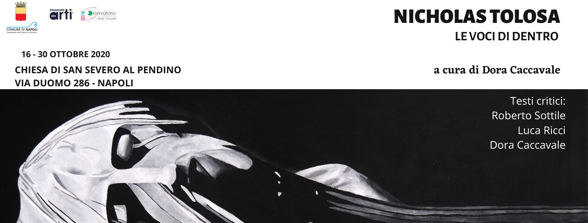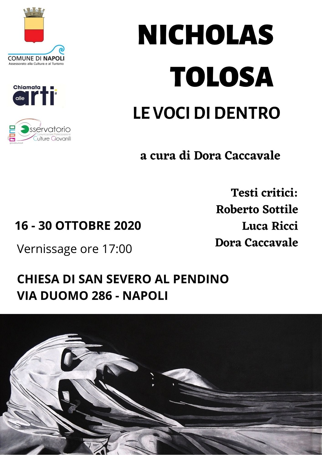 Venerdì 16 Ottobre 2020, presso la Chiesa di san Severo al Pendino, via Duomo 286 – Napoli, si inaugura alle 17,00 la personale d’arte contemporanea di Nicholas Tolosa con il patrocinio del Comune di Napoli e dell’ Osservatorio Comunicazione Partecipazione Culture Giovanili (OCPG) dell’Università di Salerno. La mostra, a cura di Dora Caccavale con testi critici di Roberto Sottile, Luca Ricci e Dora Caccavale, si intitola “Le voci di dentro”. Fino al 30 ottobre, dal lunedì al venerdì dalle 9 alle 18.