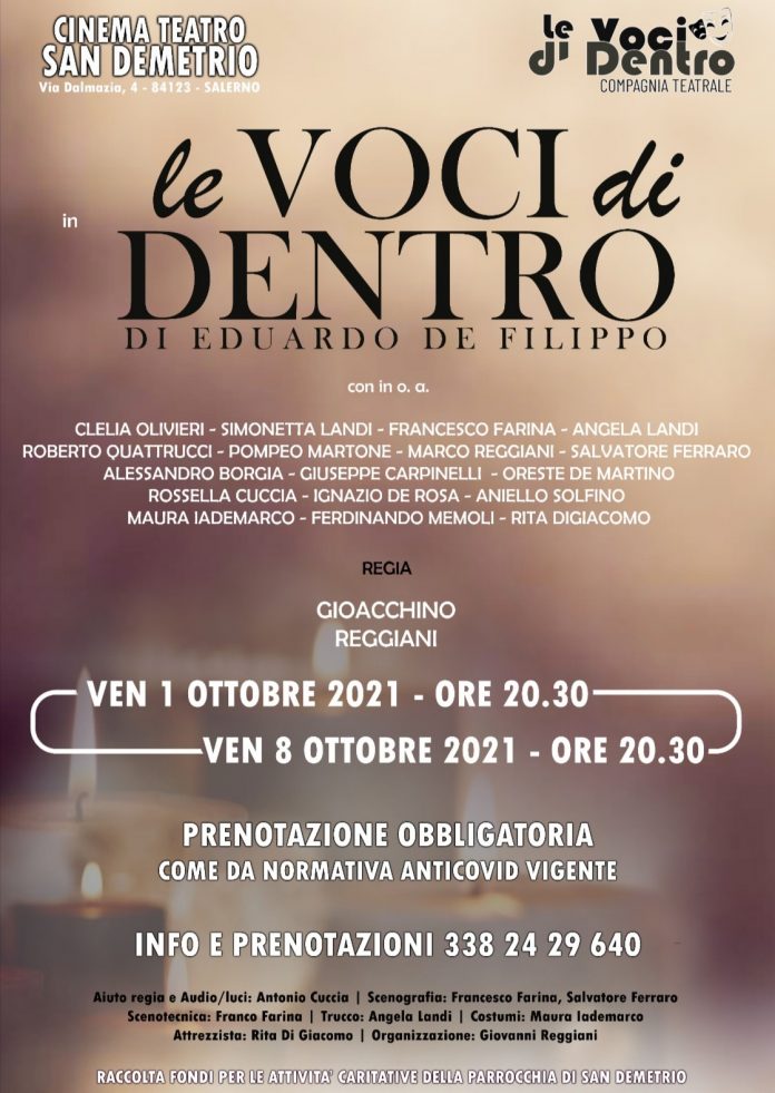 Venerdì 08/10 ore 20,30 nel Cinema Teatro San Demetrio Via Dalmazia, 6 Salerno, la compagnia teatrale LE VOCI DI DENTRO SALERNO, rappresenterà la commedia di Eduardo De Filippo dal titolo omonimo “LE VOCI DI DENTRO”.