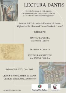 “Ecco la fiera con la coda aguzza che passa i monti e rompe i muri e l’armi! Ecco colei che tutto il mondo appuzza!”. Sono questi i versi, pronunciati da Virgilio nel XVII Canto dell’inferno di Dante che saranno recitati dall’attrice Antonella Schiavone e da Valentina Padula, sabato sera alle ore 19.00 presso la Chiesa di Santa Maria de Lama, nel centro storico di Salerno, in occasione del primo appuntamento del ciclo di letture dedicate alla Divina Commedia di Dante Alighieri organizzate dal professor Matteo Lanzetta, docente di Lettere presso il Liceo scientifico “Piranesi” di Capaccio:” Per il terzo anno consecutivo ho deciso di proporre di nuovo, insieme all’attrice Antonella Schiavone, un ciclo di letture dedicate alla Divina Commedia di Dante Alighieri che si terranno con cadenza bimestrale nella Chiesa di Santa Maria de Lama, una delle più antiche di Salerno, attualmente affidata al Touring Club di Salerno, che ne gestisce anche l’apertura al pubblico, coordinato dal Console Rosamaria Petrocelli”- ha spiegato il professor Lanzetta – “ L’evento rientra nell’ambito delle attività che organizza l’associazione culturale Erchemperto, presieduta dall’archeologa Paola Valitutti, costituita da archeologi, storici e storici dell’arte specializzati che promuove la riscoperta delle radici storico-culturali del territorio campano, attraverso la valorizzazione del patrimonio ambientale, archeologico, architettonico e monumentale”. Il professor Lanzetta ha fortemente voluto che si organizzasse questa iniziativa di alto livello culturale:” Tanti sono i motivi che mi spingono a parlare di Dante e della Commedia, ma due sono quelli che desidero mettere in evidenza. In primo luogo, l’enorme eredità rappresentata da Dante e dal suo capolavoro, eredità che sento il dovere “morale” come insegnante e uomo di cultura di preservare e di diffondere, cercando di avvicinare e di appassionare chi mi ascolta alla lettura non certo facile del più grande poema scritto da un cristiano. Il mio obiettivo ultimo è quello di lasciare nel pubblico degli spunti di riflessione, che inducano a porsi delle domande, a soffermarsi sulla complessità della realtà che ci circonda, a comprendere che la strada verso la verità può essere dura, ma anche meravigliosa. In secondo luogo, credo fermamente che Dante metta al centro del suo poema l’Uomo ed esalti valori come la creatività, la curiosità, la simpatia verso il prossimo, l’amore per la conoscenza. Se noi tendiamo, se agiamo, se disponiamo delle nostre capacità per esercitare questi valori, allora riscopriremo la nostra “umanità”, necessità quanto mai urgente in questo momento storico”. In questa edizione del ciclo di letture il professor Lanzetta ha voluto affrontare temi da lui ritenuti fondamentali nella lettura del Poema:”Quest’anno ho deciso di soffermarmi su alcuni canti che potremmo definire di passaggio tra una tappa e un’altra del cammino del sommo poeta verso la salvezza, canti in cui Dante non specchia la propria umanità in personaggi “umani”, ma piuttosto si imbatte in figure mostruose come Gerione, i Giganti, Lucifero o angeliche, come l’Angelo portinaio del Purgatorio. La lettura di questi canti permetterà non solo di cogliere aspetti meno noti della Commedia, ma anche di esaltare il genio creativo di Dante che non smette mai di stupire anche il lettore più esperto”.