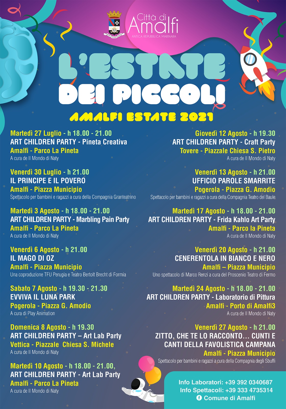 Laboratori artistici in Pineta, Luna Park in Piazza e tanti spettacoli d’autore che ripropongono i classici della tradizione istrionica e della letteratura per bambini e ragazzi. Appuntamenti divenuti oramai tradizionali e attesi da grandi e piccini, non solo amalfitani.