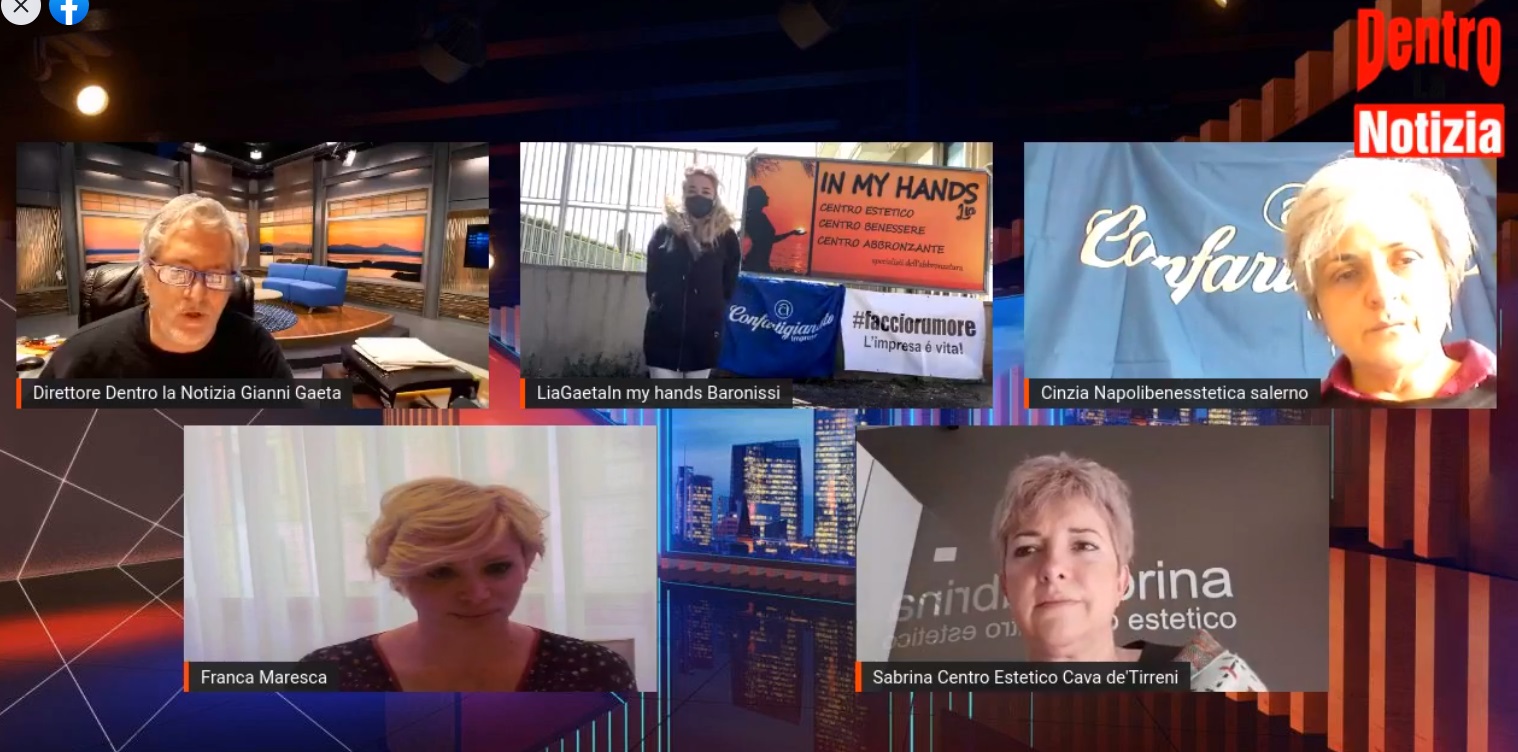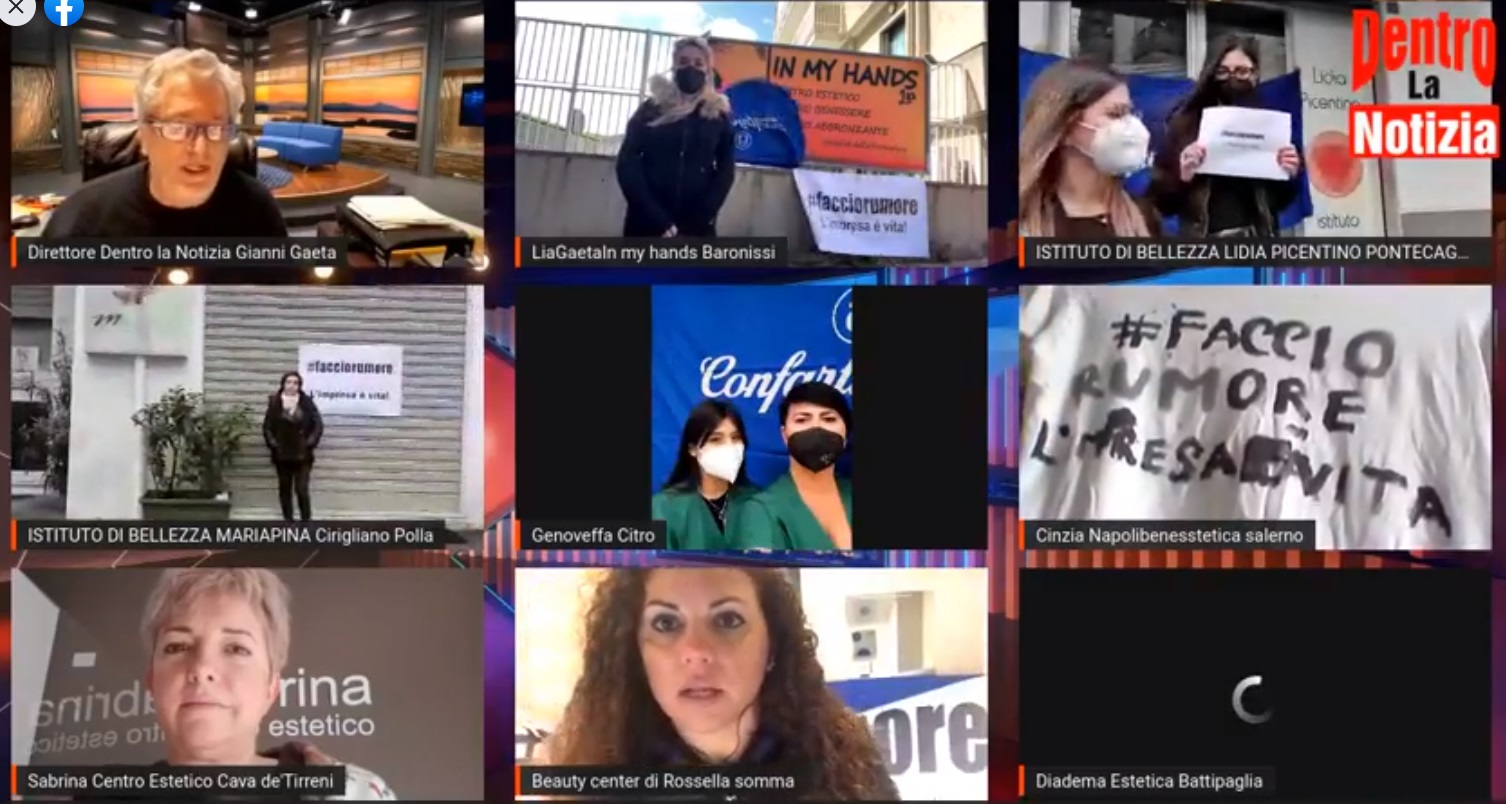 A dare voce al malcontento della categoria è stata la WebTV Dentro La Notizia che, nel corso della diretta Facebook moderata dal giornalista Gianni Gaeta, ha raccolto la composta protesta di alcune delle aziende del settore estetica associate a Confartigianato Salerno.