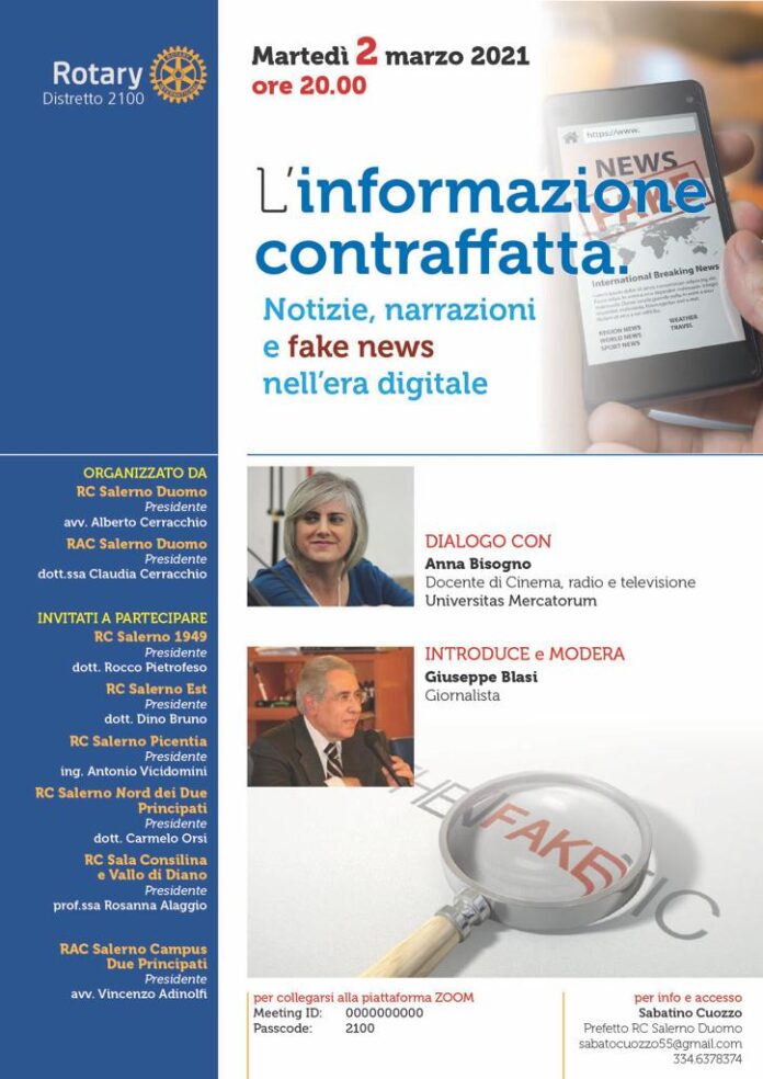 Sono queste alcune delle domande al centro del dibattito in programma martedì 2 marzo a partire dalle 20.00, promosso dal Rotary Club Salerno Duomo, con Anna Bisogno, docente di Cinema Radio e Televisione dell’Università Mercatorum di Roma che dialogherà con i soci sul tema L’informazione contraffatta. Notizie, narrazioni e fake news nell’era digitale.