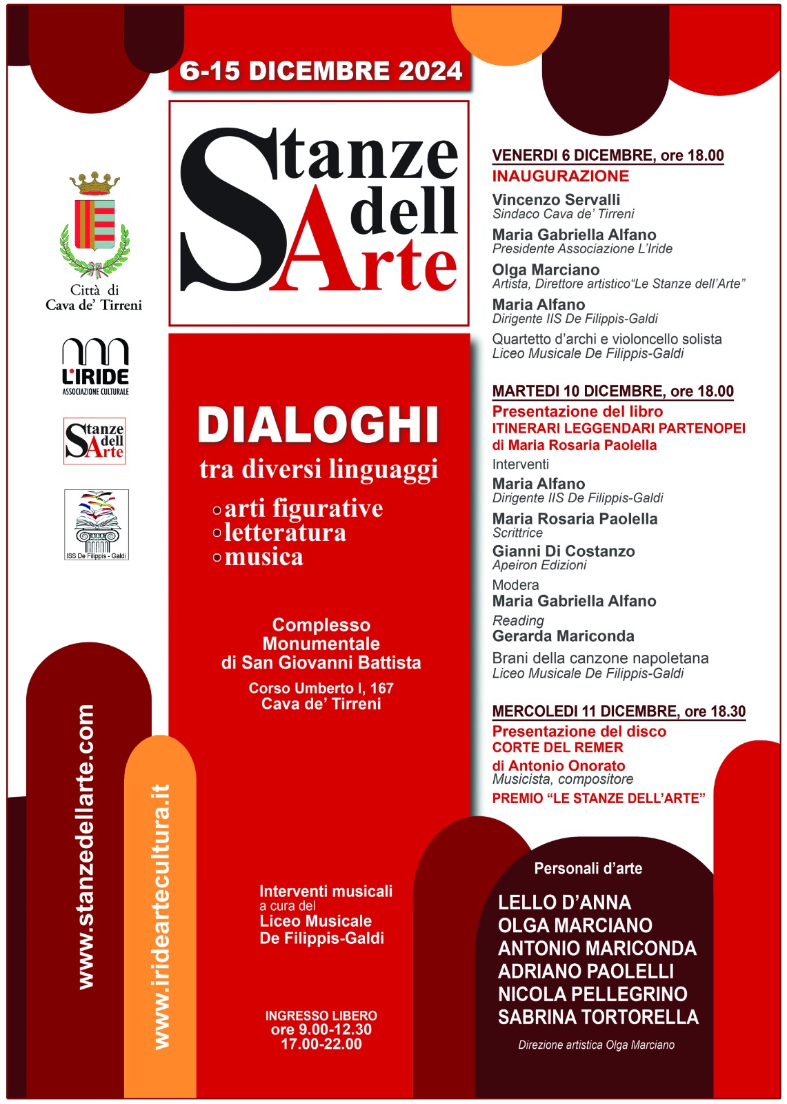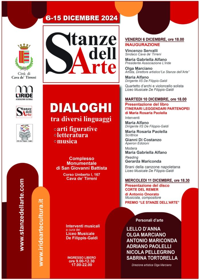 Con il patrocinio del Comune di Cava de’ Tirreni, l’Associazione L’Iride, presieduta da Maria Gabriella Alfano, torna a promuovere l’arte e la cultura con un evento unico nel suo genere: il Format multidisciplinare “Le stanze dell’arte- dialoghi tra diversi linguaggi: Arti figurative, Letteratura e Musica”, in programma dal 6 al 15 dicembre 2024 presso il suggestivo Complesso Monumentale di San Giovanni Battista.