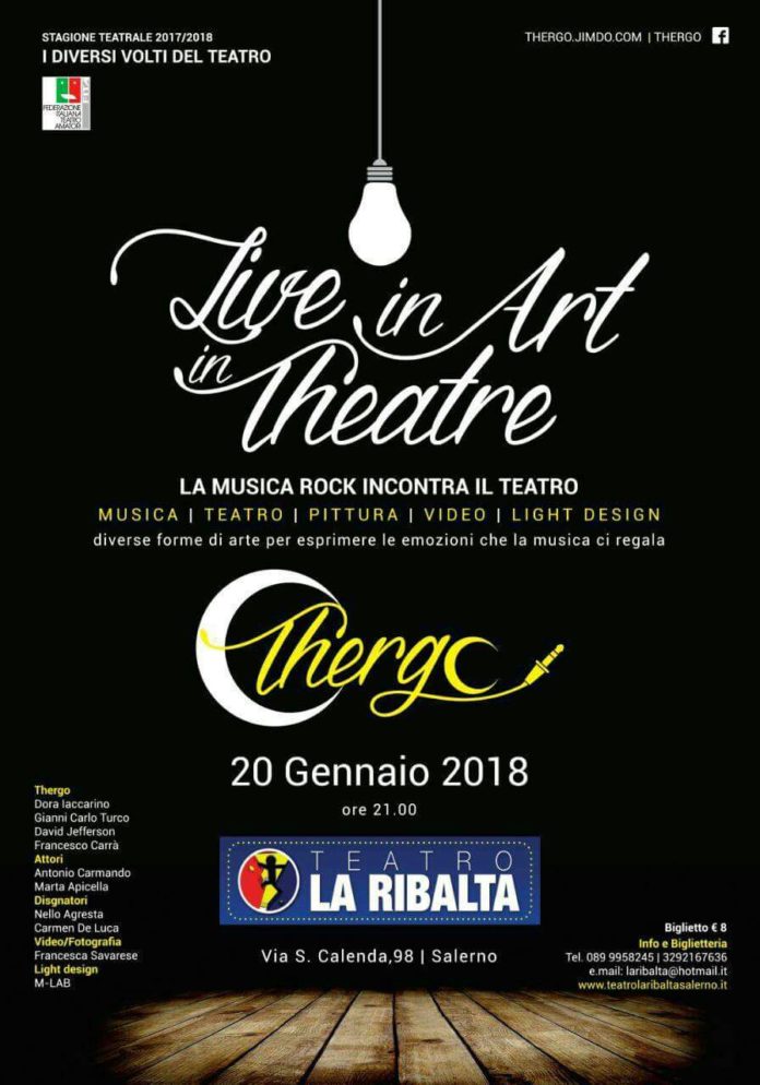 Sabato 20 gennaio, alle 21 la musica rock incontra il teatro, ovviamente sul palco de La Ribalta di Salerno. I Thergo proporranno “Live in Art in Theatre”, uno spettacolo composto dalla nostra musica Rock unita a varie arti visive quali il Disegno, il Light Design e la Recitazione.