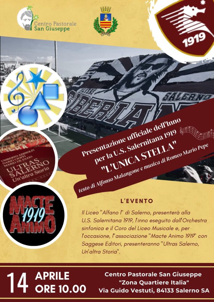 A seguito degli interventi, moderati dalla professoressa Gilda Ricci, l’Orchestra sinfonica e il Coro del Liceo Musicale si esibiranno, accompagnati dai docenti – autori Alfonso Malangone (testo) e Romeo Mario Pepe (musica), nell’esecuzione dell’inno “L’unica Stella”, che sarà ufficialmente donato alla U.S. Salernitana 1919 alla presenza dall’Amministratore Delegato Maurizio Milan, il Team Manager Sasà Avallone e lo SLO Domenico Napoli. Gli stessi saranno omaggiati della pergamena ufficiale, raffigurante lo spartito musicale dell’inno.
