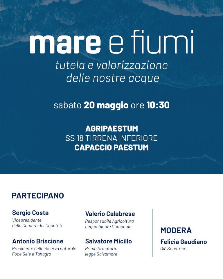 “Sabato 20 maggio alle ore 10:30 presso la sala conferenze dell’Agripaestum a Capaccio Paestum è in programma il convegno “Mare e fiumi, tutela e valorizzazione delle nostre acque”.