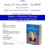 “Siamo davvero orgogliosi –commenta l’Assessore alla Cultura del Comune di Sala Consilina Gelsomina Lombardi– di poter ospitare a Sala Consilina Maria Romana De Gasperi, proprio in occasione del 70° anniversario delle elezioni del 1948, e di poter nel contempo presentare il libro di Remo Roncati. Alcide De Gasperi fu lo statista politico italiano che, profondamente legato alla fede cattolica, consacrò la sua vita politica all’affermazione della giustizia sociale, all’elevazione morale, culturale ed economica dei lavoratori, alla ricerca di una diffusa solidarietà fra classi sociali. Un tema che, a 70 anni di distanza dal 1948, è tornato oggi di strettissima attualità: come hanno dimostrato le recenti elezioni politiche”.