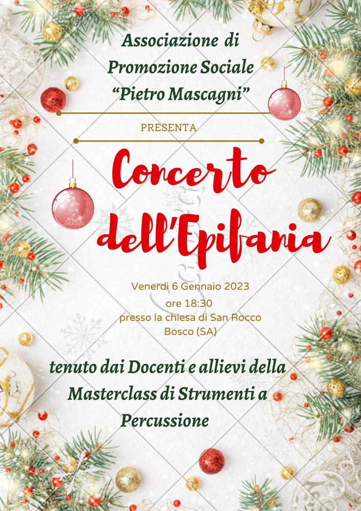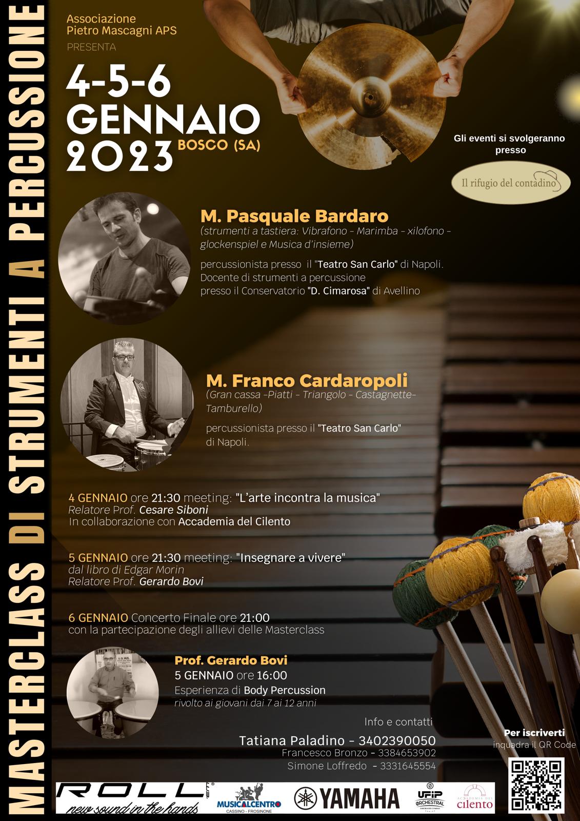 La serata finale per lāappuntamento di gennaio con la masterclass degli strumenti a percussione ĆØ fissata per venerdƬ 6 gennaio 2023 alle ore 18:30 presso la Chiesa di San Rocco a Bosco (Sa).