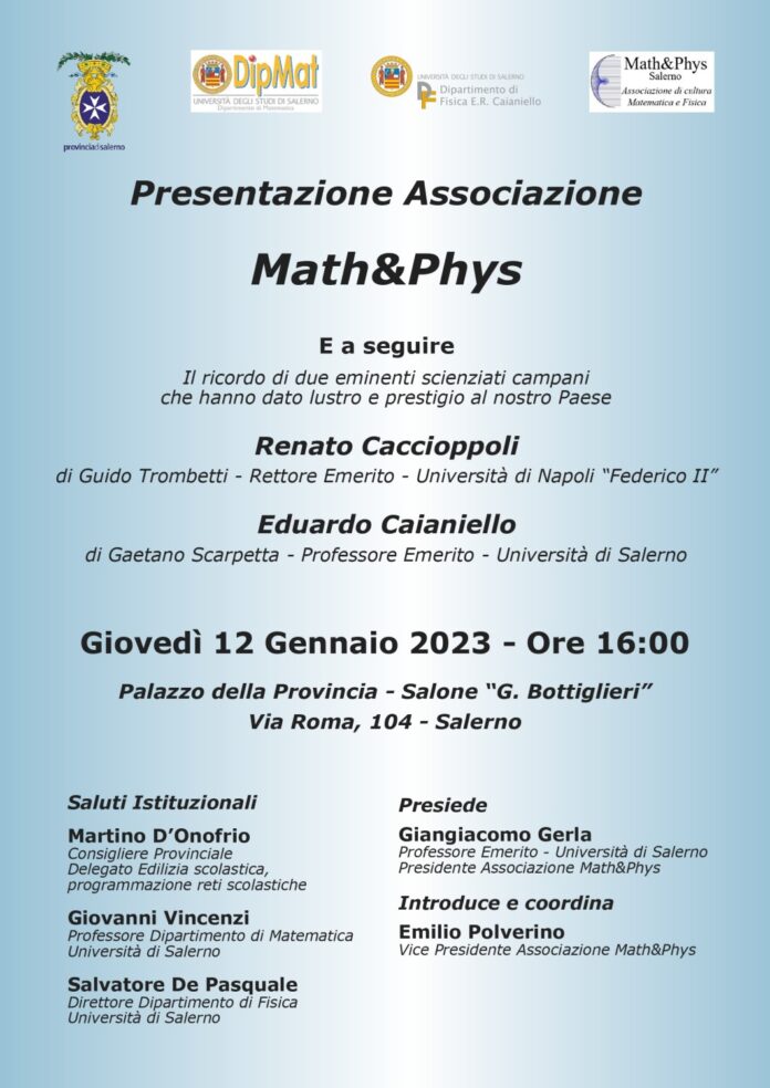 Giovedì 12 Gennaio 2023, alle ore 16:00, nel Salone “G. Bottiglieri” del Palazzo della Provincia di Salerno, sarà presentata alla cittadinanza l’Associazione di Cultura Matematica e Fisica “Math&Phys“, nata per volontà di ben 18 docenti delle scuole secondarie superiori e dell’Università degli Studi di Salerno.