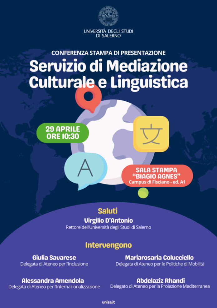 Mercoledì 29 aprile, alle ore 10.30, la Sala Stampa “Biagio Agnes” (Campus di Fisciano) ospiterà la Conferenza stampa di presentazione del nuovo Servizio di Mediazione Culturale e Linguistico dell’Università di Salerno.