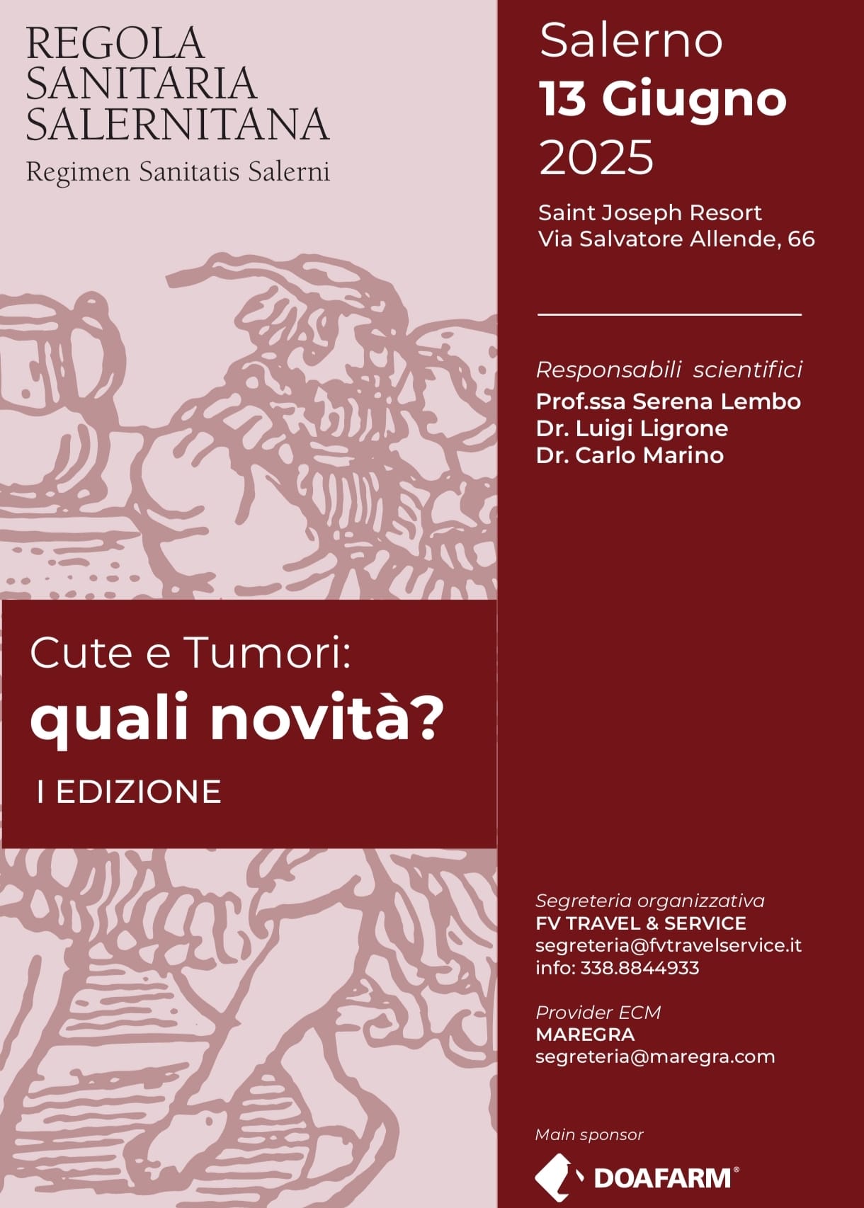 Una tematica attuale e formativa, che sarà affrontata durante la I edizione del Convegno dal titolo: Cute e Tumori: quali novità”, che si terrà a Salerno il 13 giugno 2025, presso il Saint Joseph Resort( Via Salvatore Allende, 66), organizzato dai Responsabili Scientifici Prof.ssa Serena Lembo, Dr.Luigi Ligrone, Dr.Carlo Marino.