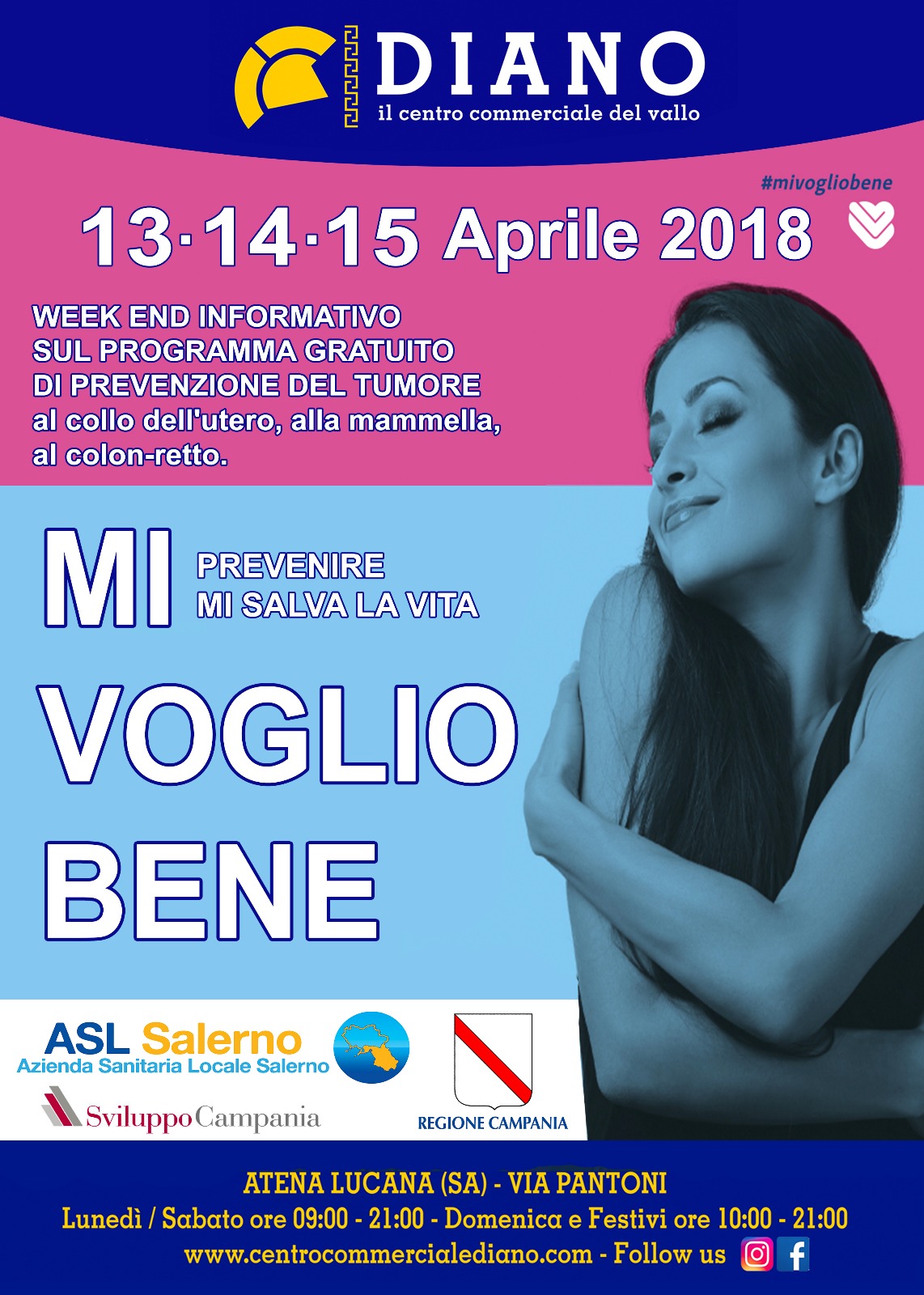 La campagna di comunicazione “Mi voglio Bene”, realizzata dalla Regione Campania in collaborazione con Sviluppo Campania, con l’obiettivo di incentivare l’adesione agli screening oncologici gratuiti, dal 13 al 15 aprile prossimo farà tappa ad Atena Lucana, presso il Centro Commerciale Diano.
