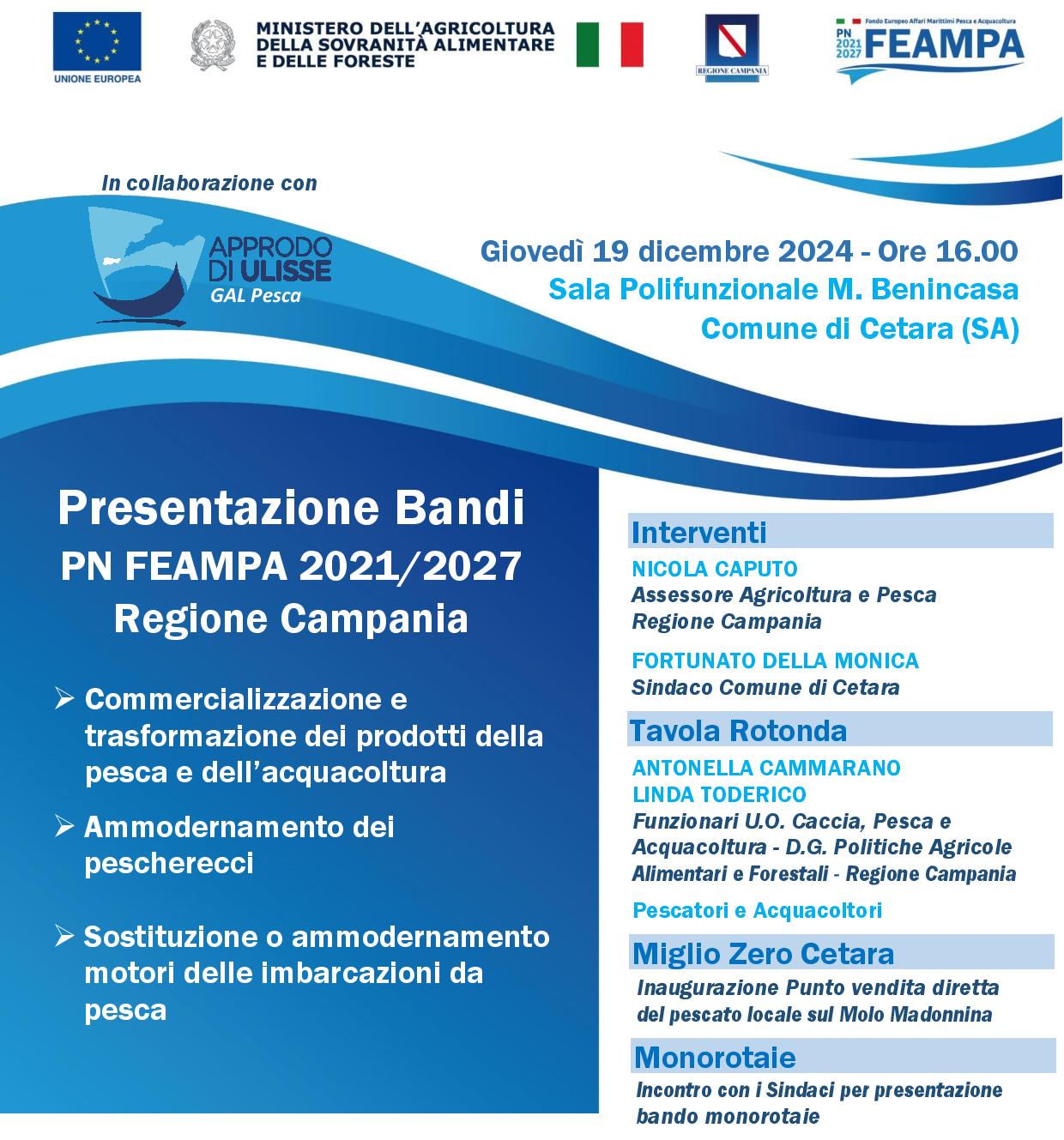 L’iniziativa destinata al comparto della pesca è in programma a partire dalle ore 16 presso la Sala Polifunzionale M. Benincasa dove sono previsti gli interventi dell’Assessore all’Agricoltura e Pesca della Regione Campania, Nicola Caputo, del Sindaco di Cetara, Fortunato Della Monica e del funzionari U.O. Caccia, Pesca e Acquacoltura (D.G. Politiche Agricole Alimentari e Forestali della Regione Campania) Antonella Cammarano e Linda Toderico.