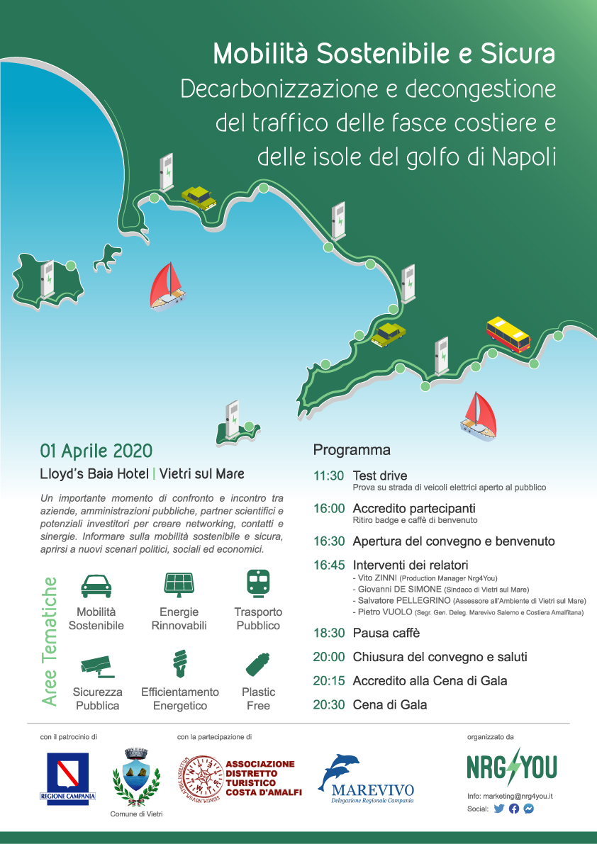 Questo il senso del convegno “Mobilità Sostenibile e Sicura – Decarbonizzazione e decongestione del traffico delle fasce costiere e delle isole del golfo di Napoli”, tra aziende e rappresentanti delle amministrazioni locali, che Nrg4You, in collaborazione con il Comune di Vietri sul Mare, ha organizzato per la giornata del 1 aprile dalle ore 16 presso il Lloyd’s Baia Hotel.