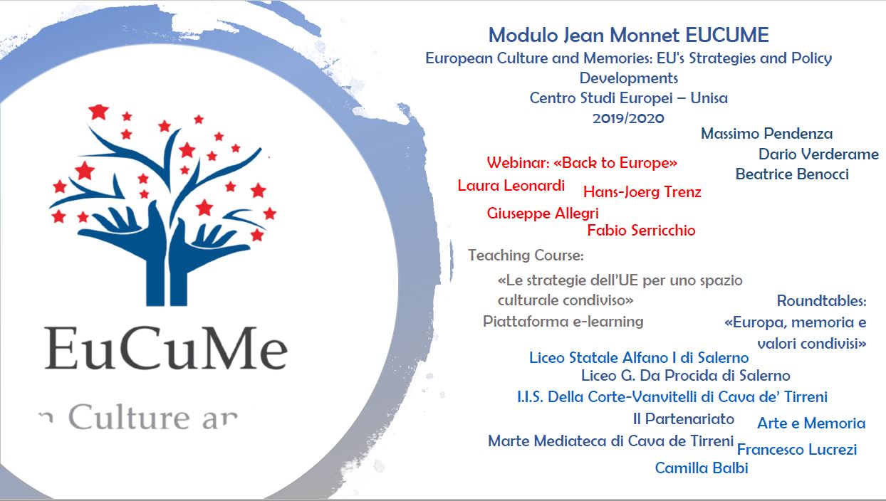 Nell’attesa di riprendere le attività del Modulo, a partire dal prossimo mese di settembre 2020, è possibile rivedere e riascoltare tutti gli incontri, i dibattiti e i seminari promossi e organizzati dal Modulo e dal Centro Studi Europei collegandosi al sito http://www.centrostudieuropei.it/eucume/ . Allo stesso tempo, in piena coerenza con le finalità promosse dalla Ue, di massima diffusione della conoscenza della storia e delle azioni promosse dalla Comunità europea, il Centro Studi Europei ha deciso di rendere fruibile a tutti, sempre in forma gratuita, i contenuti della piattaforma e-learning. Coloro che sono interessanti, docenti, studenti e rappresentanti della società civile, possono accedere ai corsi che, una volta ultimati, vedono riconosciuto un attestato valido ai fini di legge: www.centrostudieuropei-elearning.it .