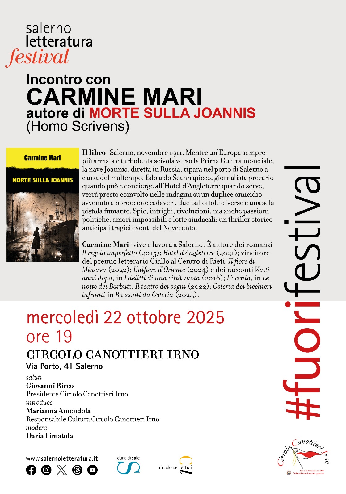 Si presenta mercoledì 22 ottobre 2025 alle 19 al Circolo Canottieri Irno (Via Porto 41) nell’ambito di Salerno Letteratura Festival Morte sulla Joannis, l’ultimo appassionante romanzo di Carmine Mari pubblicato da Homo Scrivens.