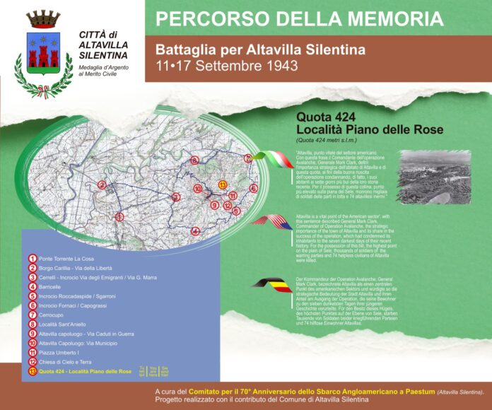 Alla realizzazione del Museo si affiancherà un “percorso della memoria” con il quale evidenziare e far conoscere, attraverso pannelli descrittivi multilingua contenenti foto e documentazioni storiche, i luoghi degli eventi bellici coinvolti dall’11/9/1943 al 17/9/1943 nella Battaglia di Altavilla. Le tabelle storico-turistiche, impreziosite da qr-code permetteranno ai fruitori di collegarsi ad uno specifico portale culturale, che sarà appositamente ideato e collegato al sito del nostro Comune, in cui troveranno spazio informazioni, filmati, foto storiche, bibliografia inerente, al fine di ampliare e soddisfare la sete di conoscenza di ciascun fruitore. Realizzato dal Comitato per il 70° Anniversario dello sbarco Anglo-Americano a Paestum è stato donato alla cittadinanza al solo scopo di rendere imperitura la memoria di coloro che hanno combattuto in nome della difesa della nostra libertà.